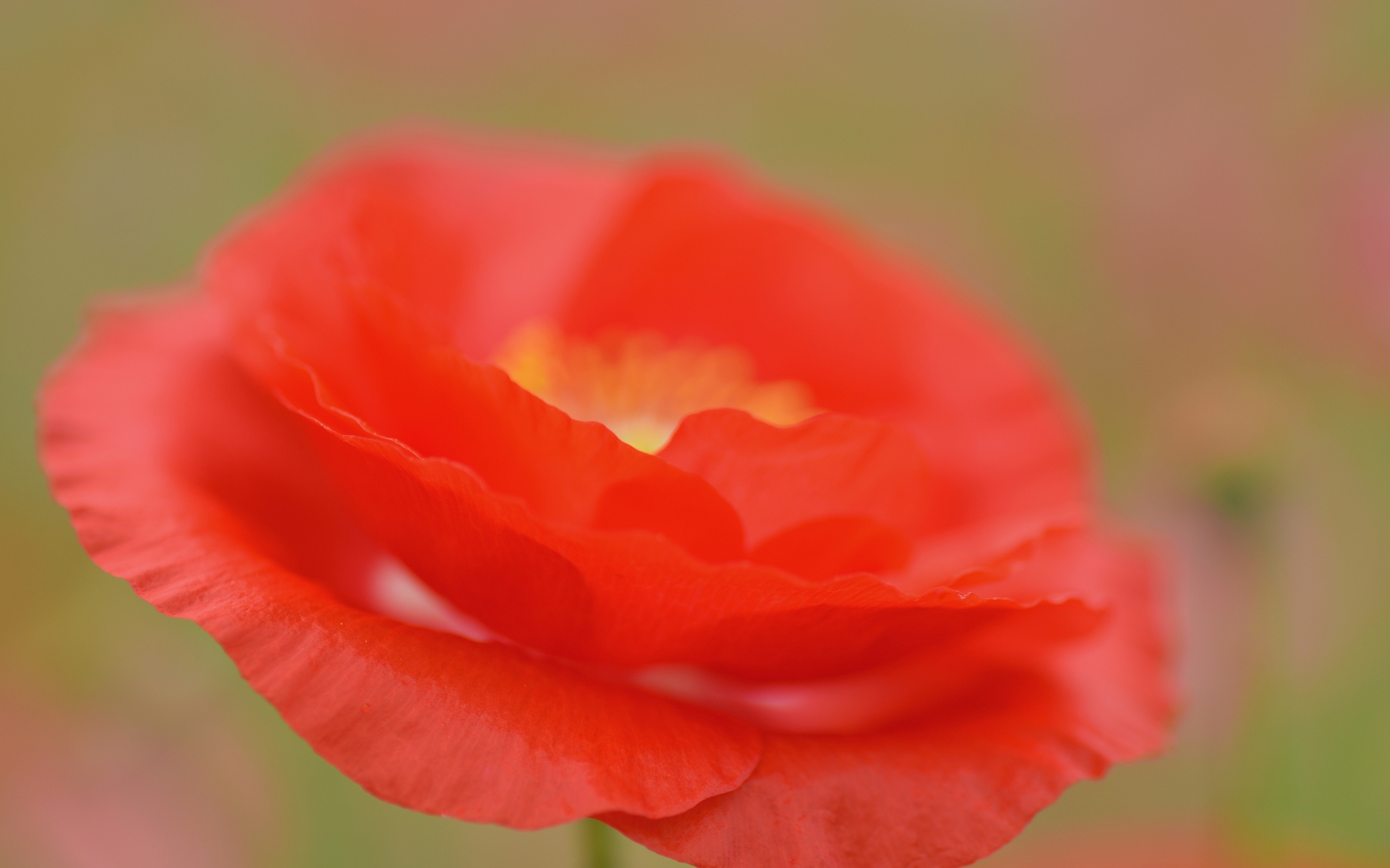 Description: A red flower with a green background and a blurry background of the flower is a single flower with a yellow center.