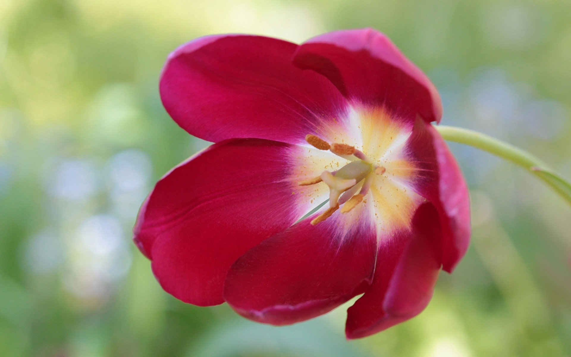 Description: A red flower with a yellow center in a field of grass and trees in the background.