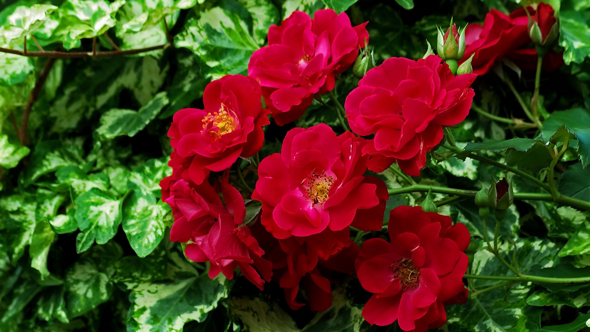 Description: A bunch of red flowers that are in a bush together with green leaves around them and a yellow center.