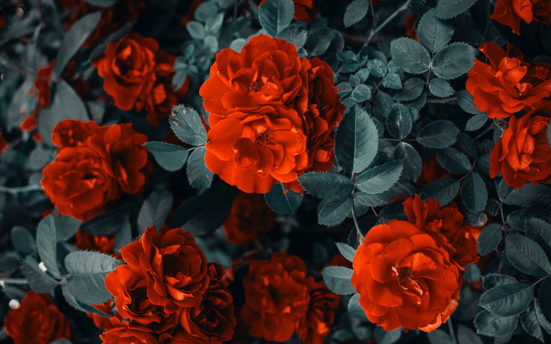 Description: A bunch of red flowers that are on a bush together in the dark night time.