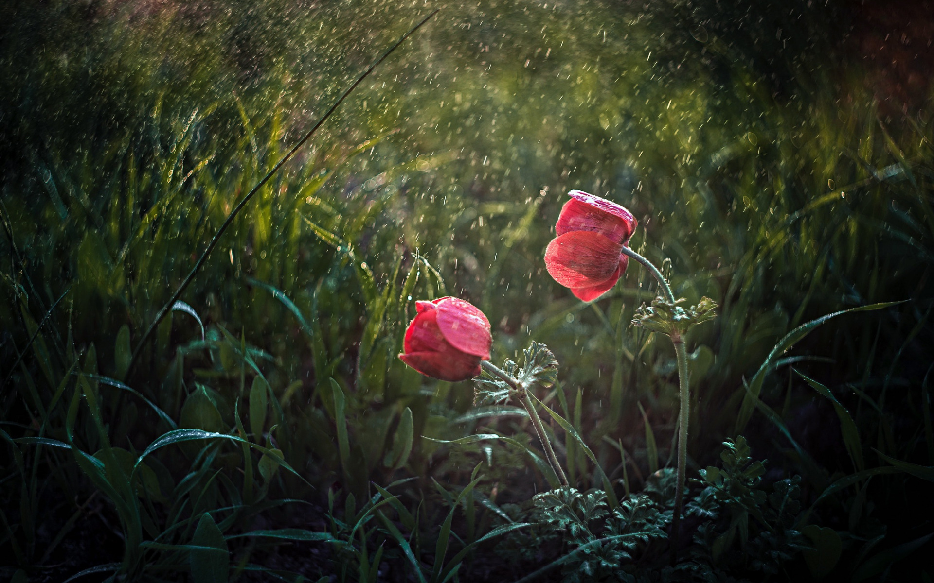 Description: Two red flowers in a grassy field with water droplets coming off of them and a green background with grass and flowers.