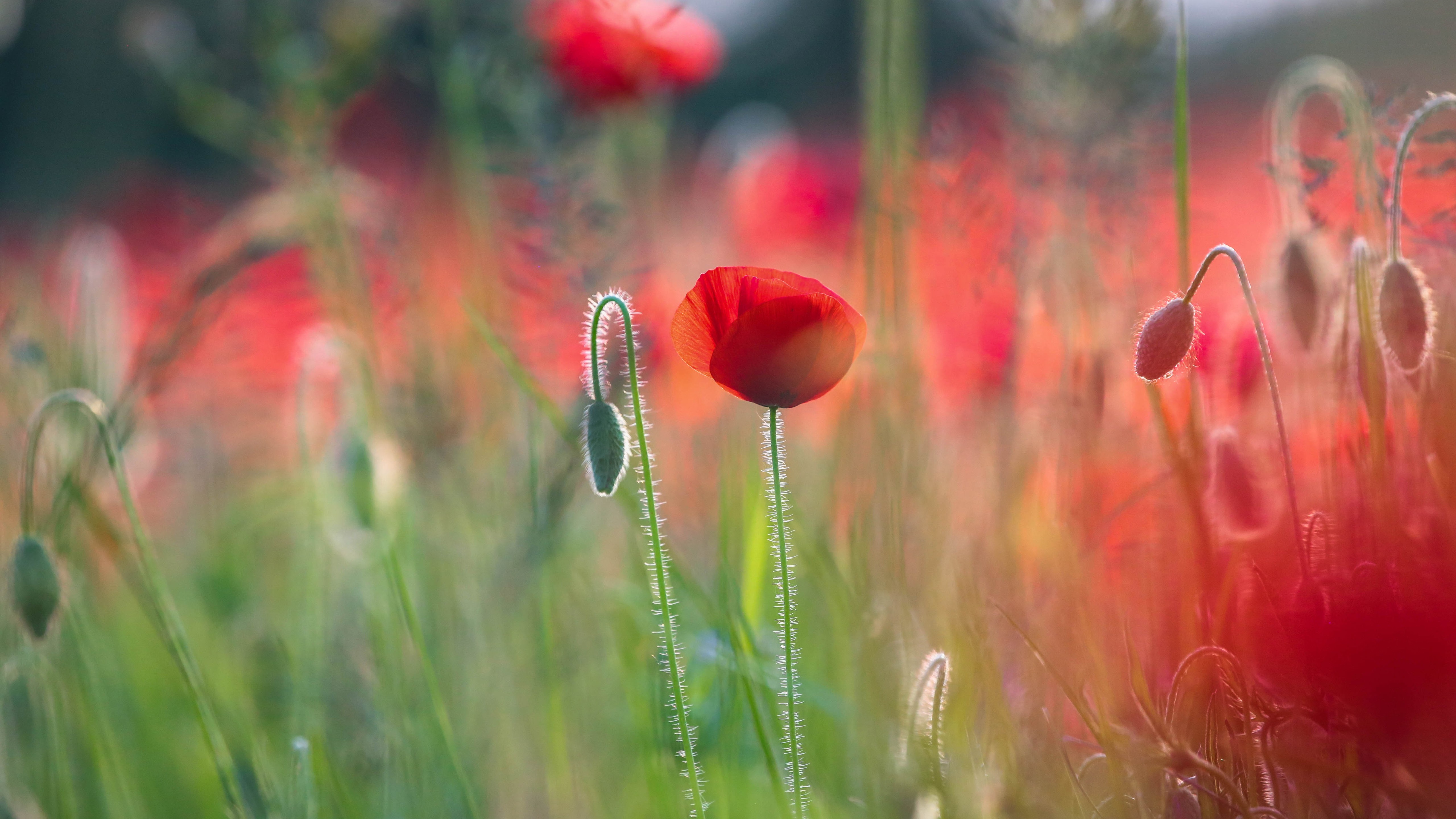 Description: A field of red flowers with green stems and grass in the foreground and a blurry background of red flowers.