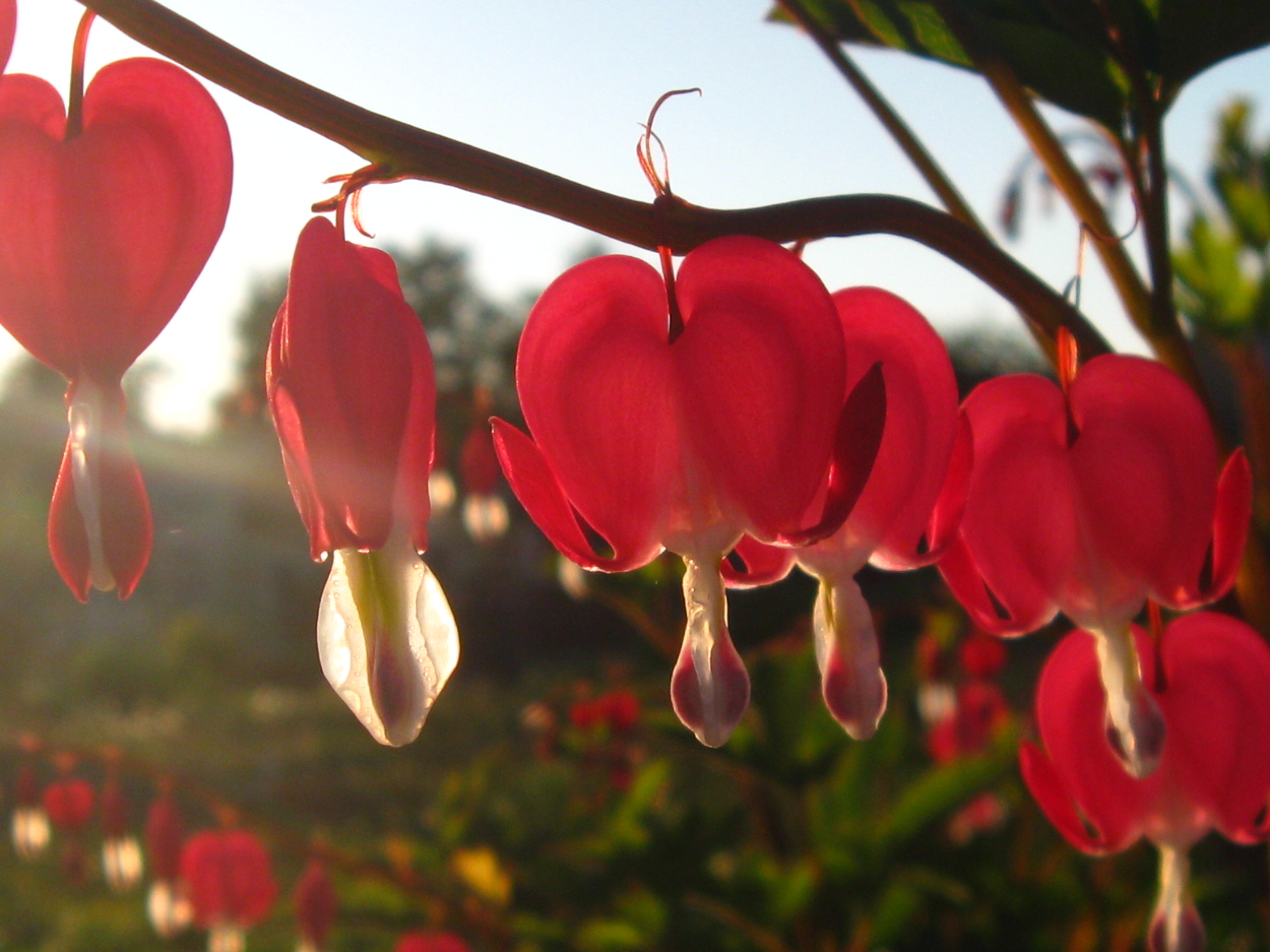 Description: A bunch of red flowers hanging from a tree branch with sunlight shining through the leaves and the flowers in the background.