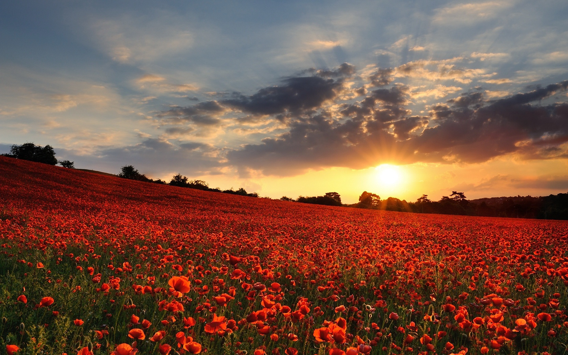 Description: A field of red flowers with the sun setting in the background and clouds in the sky above it.