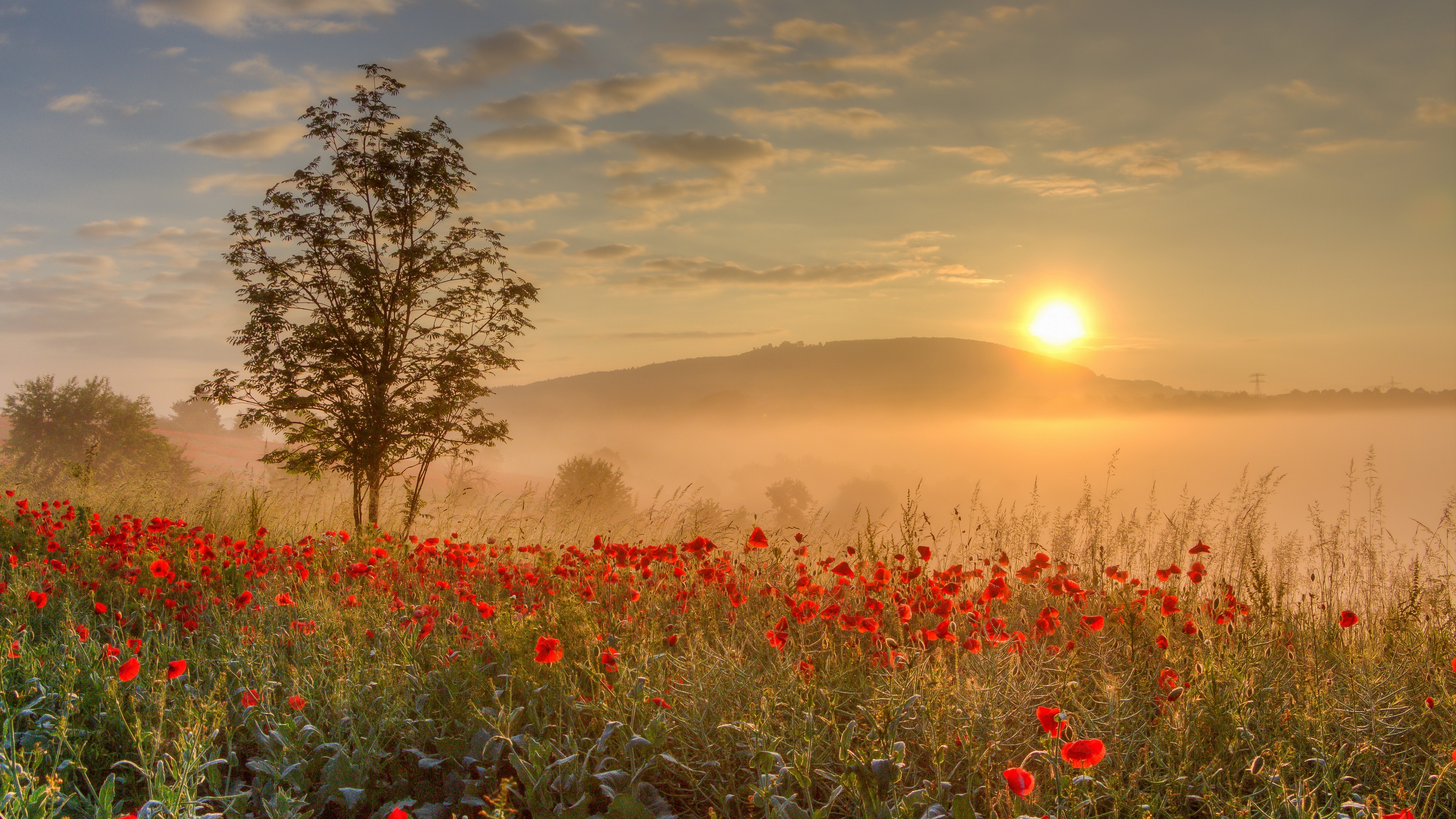 Description: A field of red flowers with the sun setting in the background and fog in the air above it.