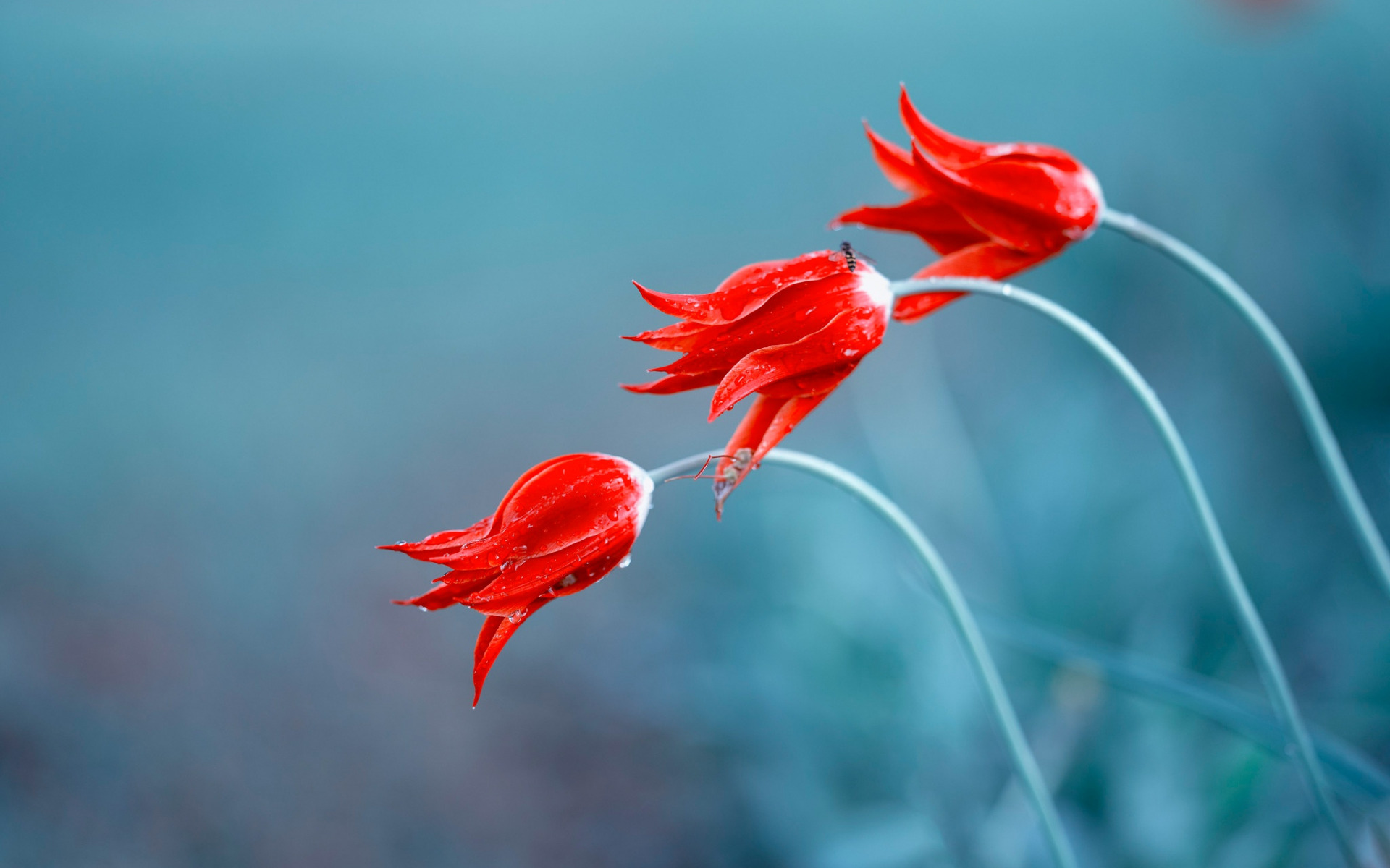 Description: A close up of two red flowers with water droplets on them and a blurry background of blue and green.