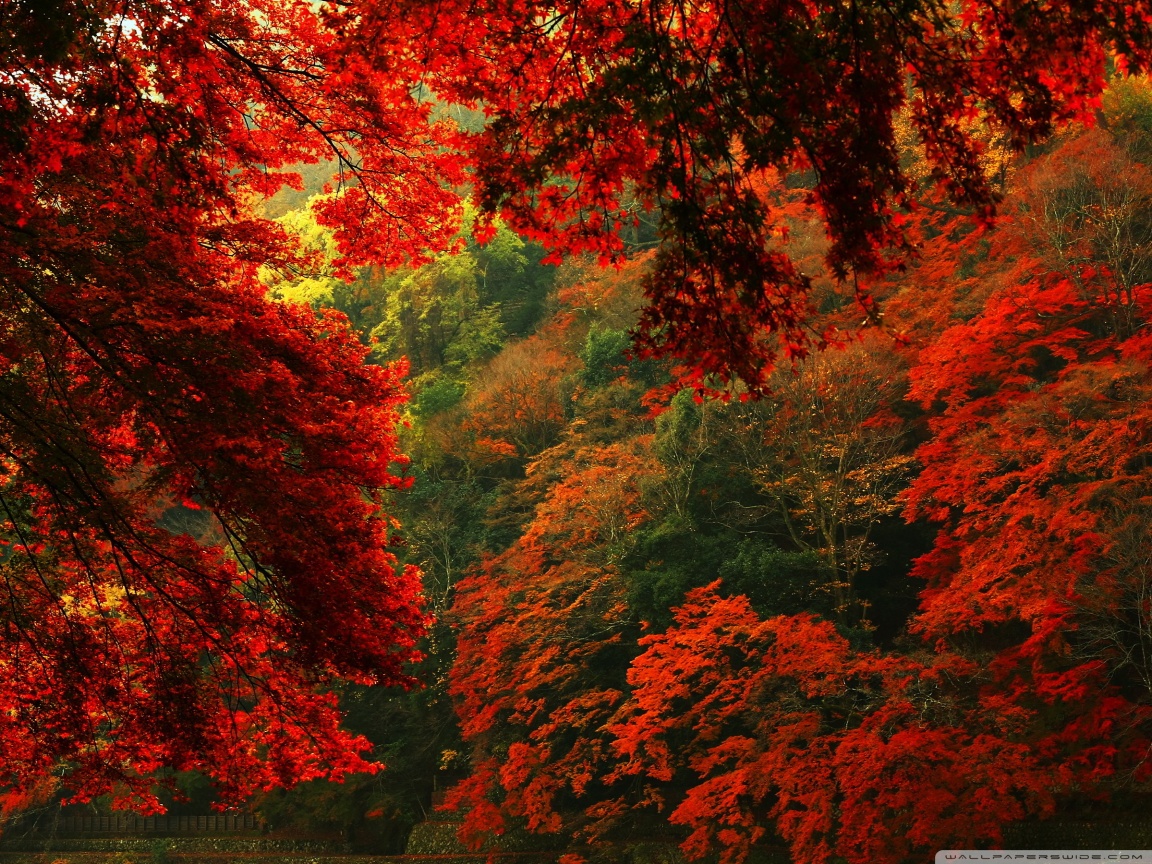 Description: A forest filled with lots of red trees next to a river filled with water and surrounded by lush green trees.