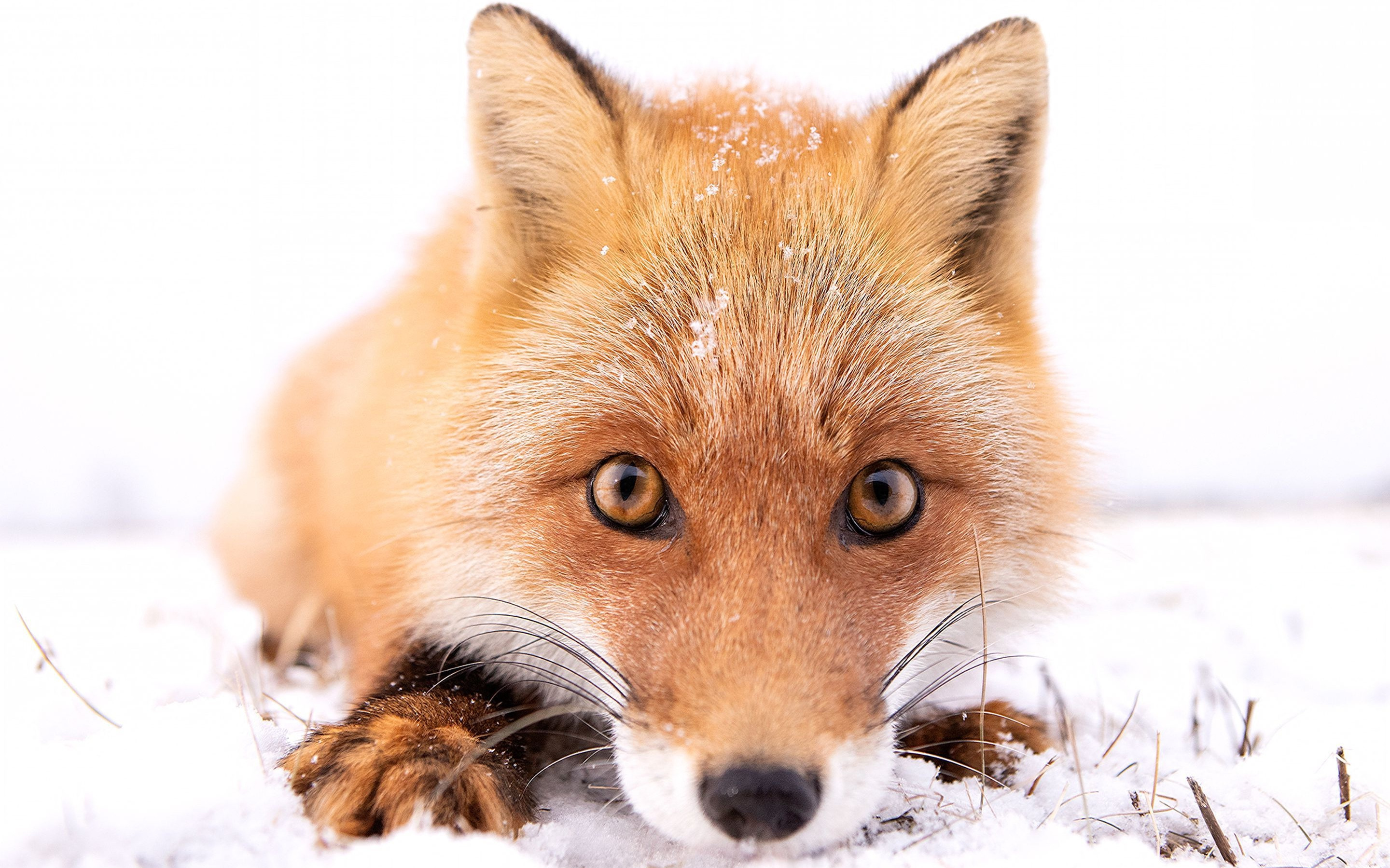 Description: A red fox is laying in the snow looking at the camera with a sad look on its face and eyes.
