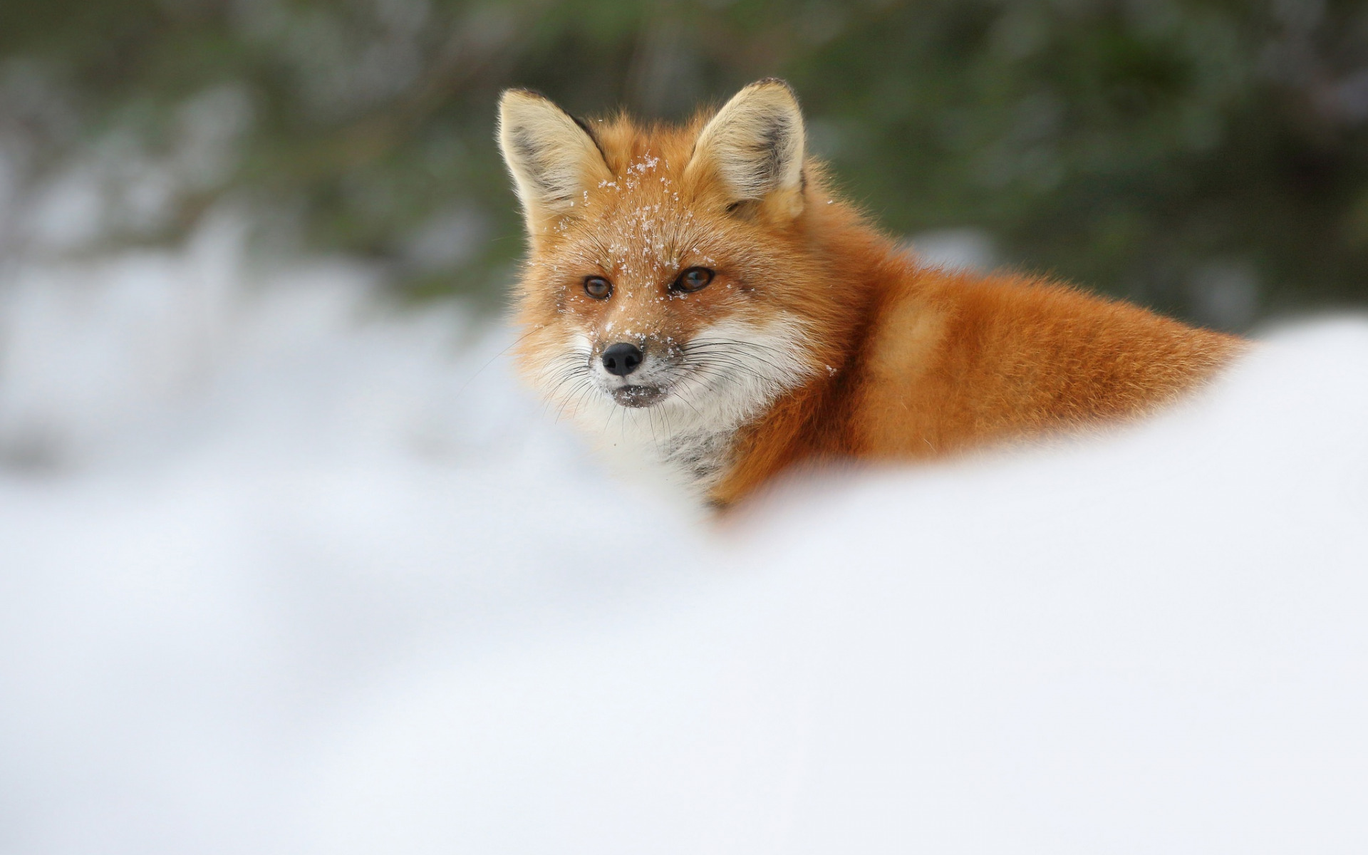 Description: A red fox looking at the camera in the snow with trees in the background in the background.