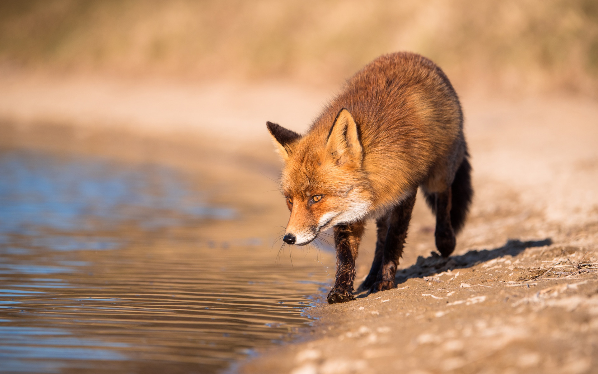 Description: A red fox is walking along the water's edge near the shore of a lake or pond.