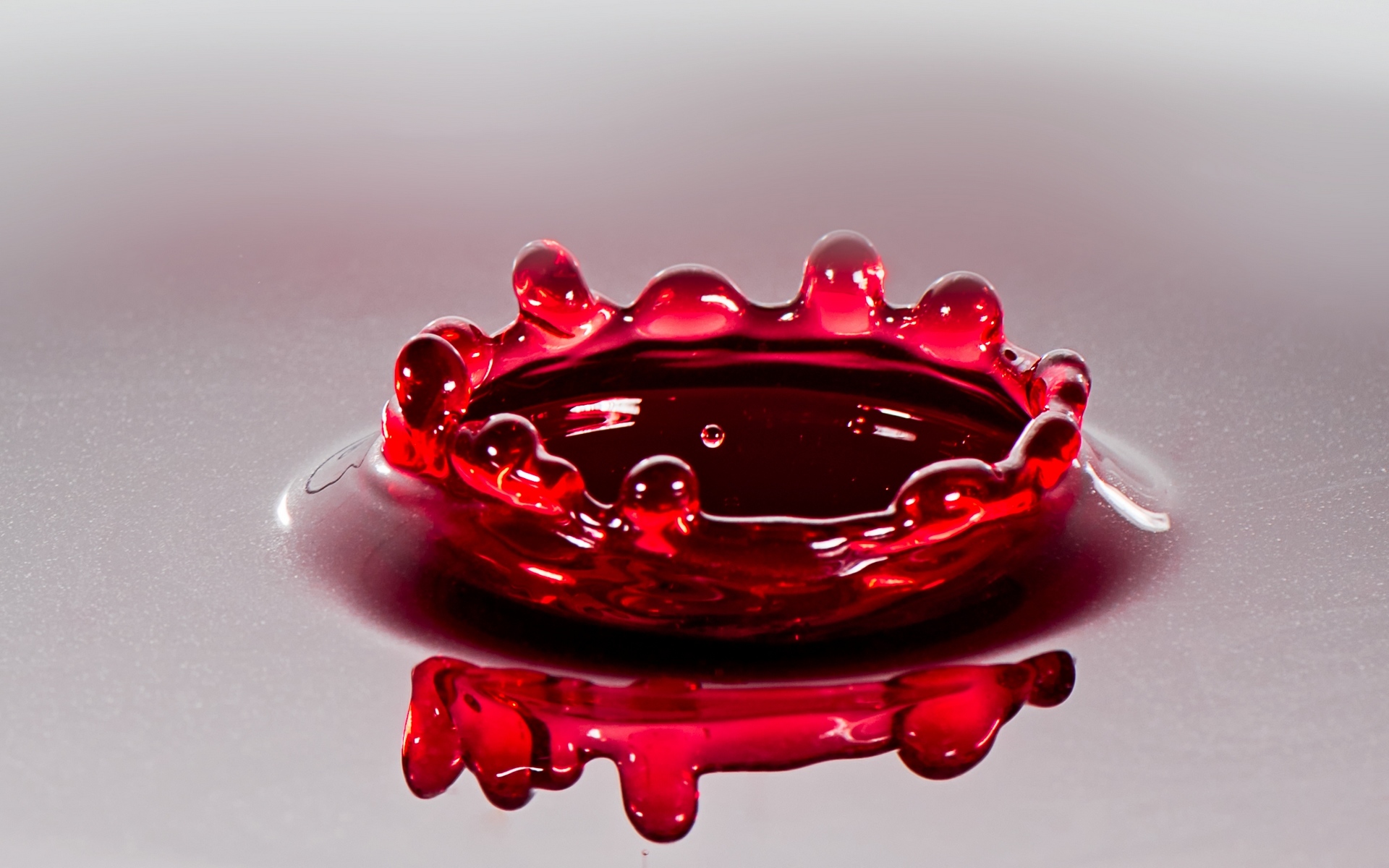 Description: A red glass bowl with a crown on top of it on a table top with a reflection of the bowl.
