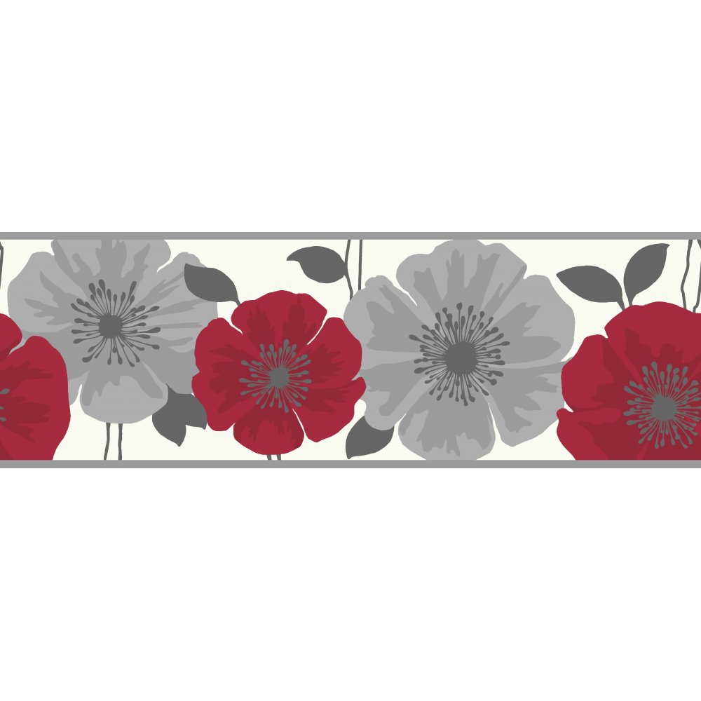 Description: A red and gray flower border with leaves on it's sides and a gray and white background with red flowers.