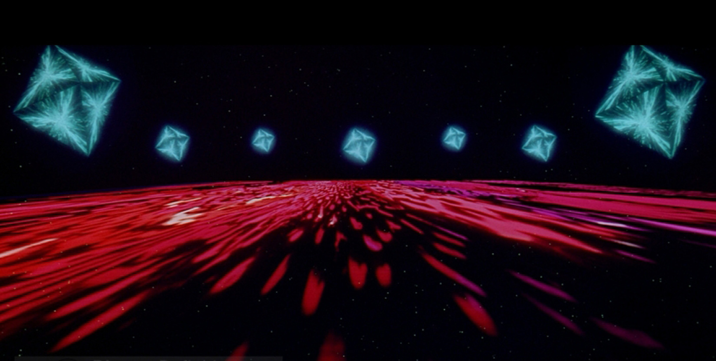 Description: A computer generated image of a red and green object with many smaller objects in the background and a black background.