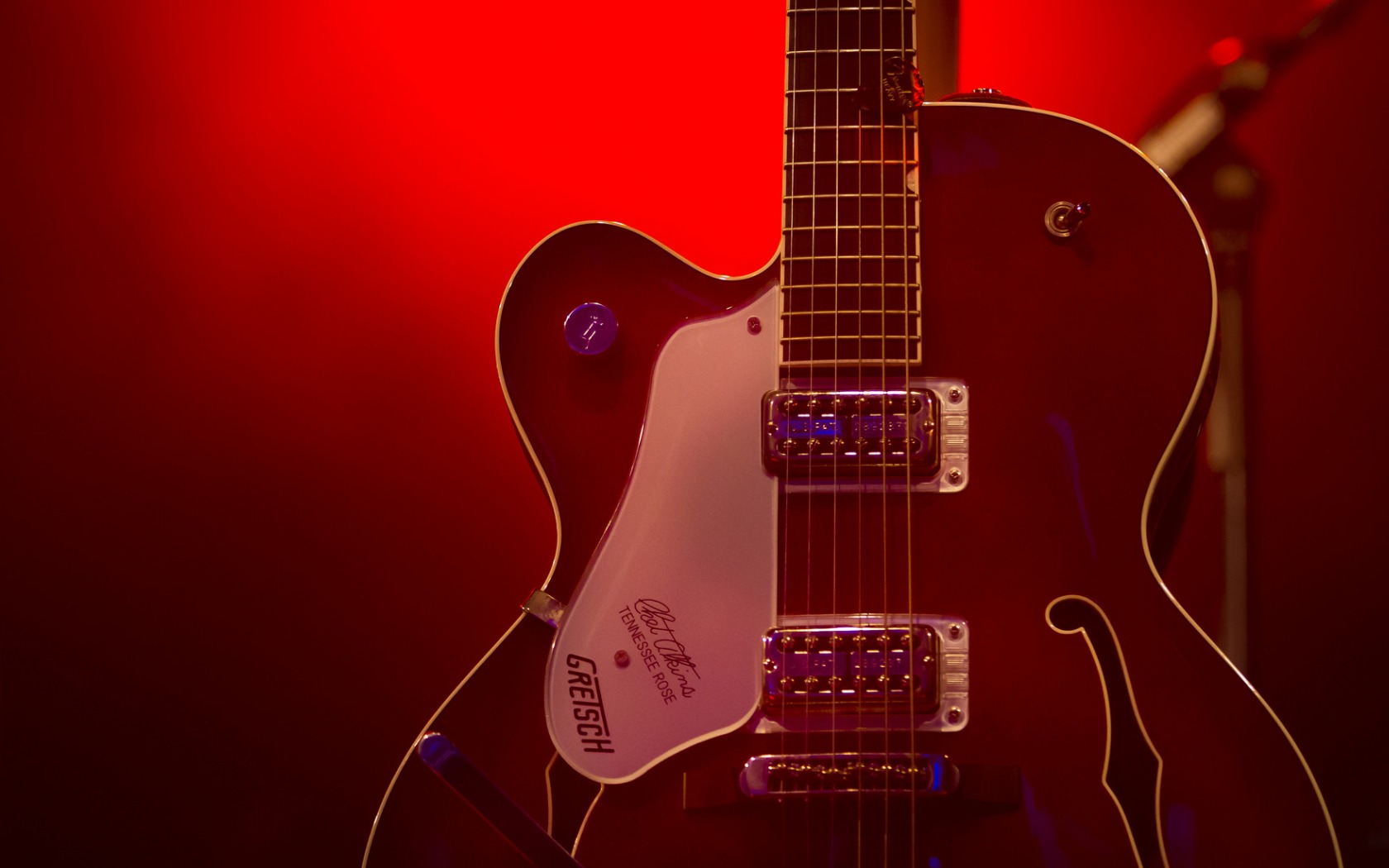Description: A red guitar with a microphone in the background and a red wall behind it with a red light behind it.