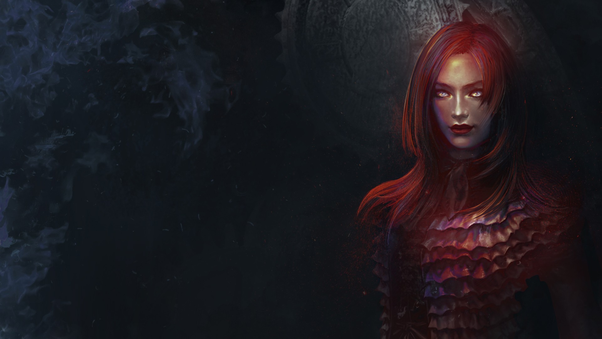 Description: A woman with red hair and a black dress in a dark room with a large tree behind her and a dark background.