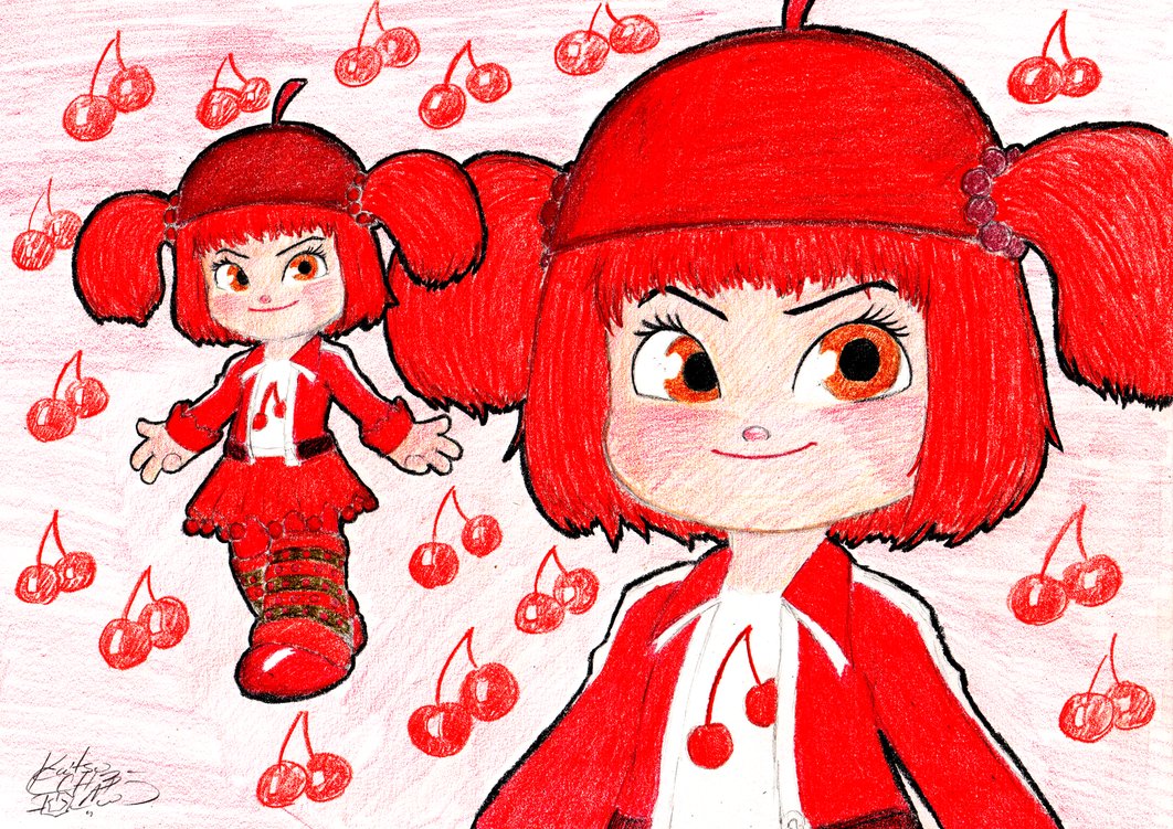 Description: A drawing of a girl with red hair and a red hat with cherries on it and a red doll with a red dress.