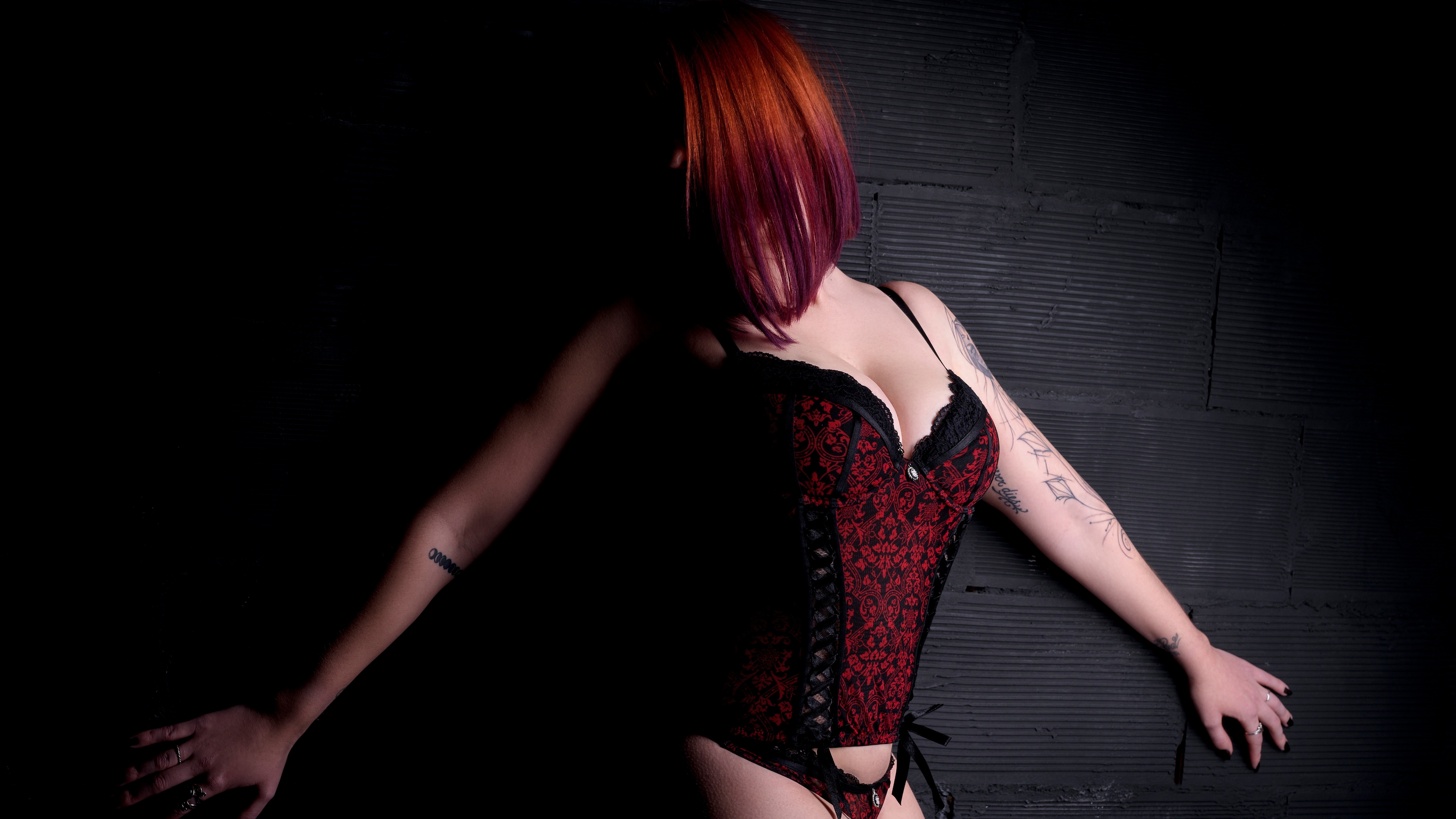 Description: A woman with red hair wearing a corset and stockings.
