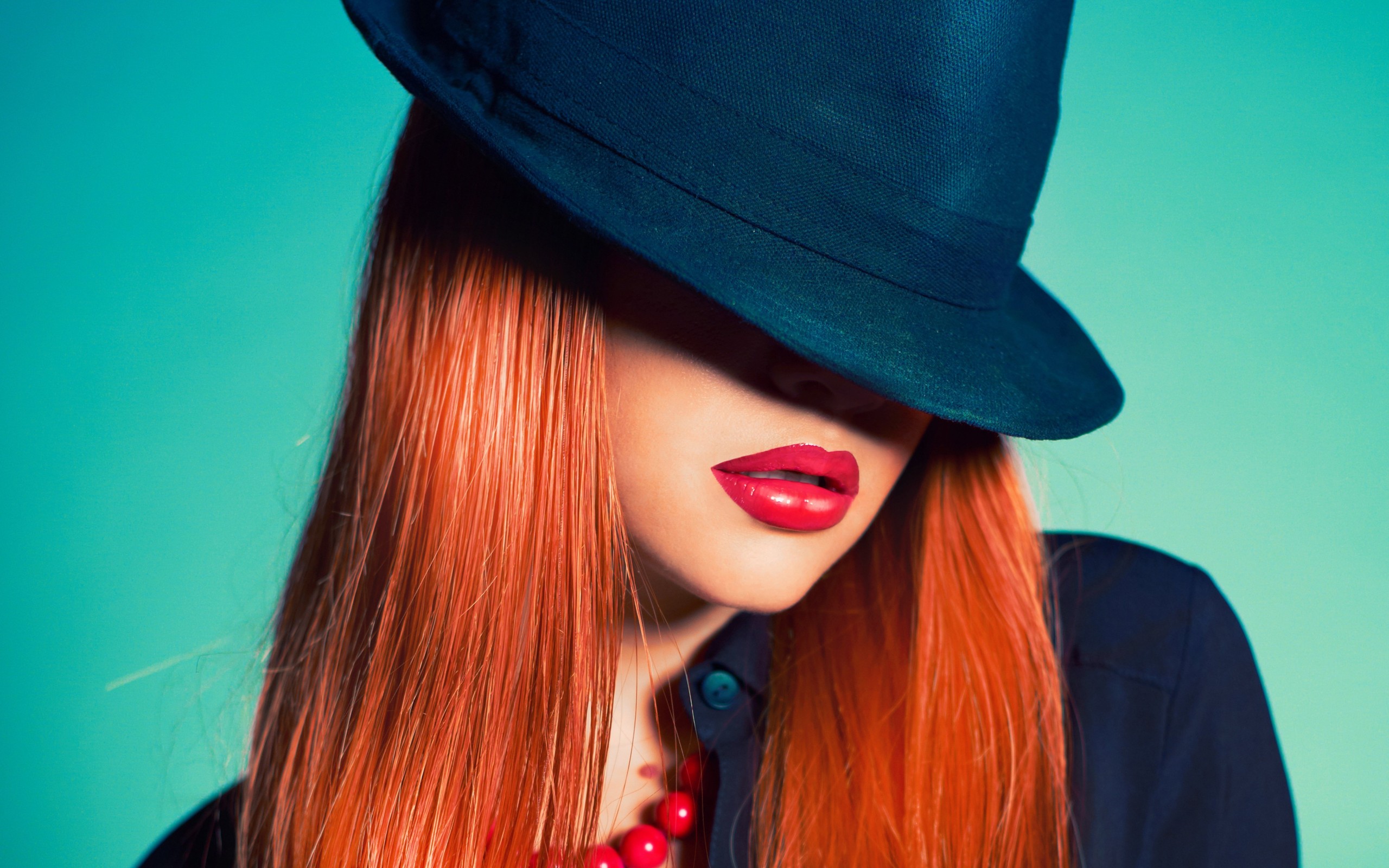 Description: A woman with red hair wearing a hat and a red necklace and a black shirt and a blue background.