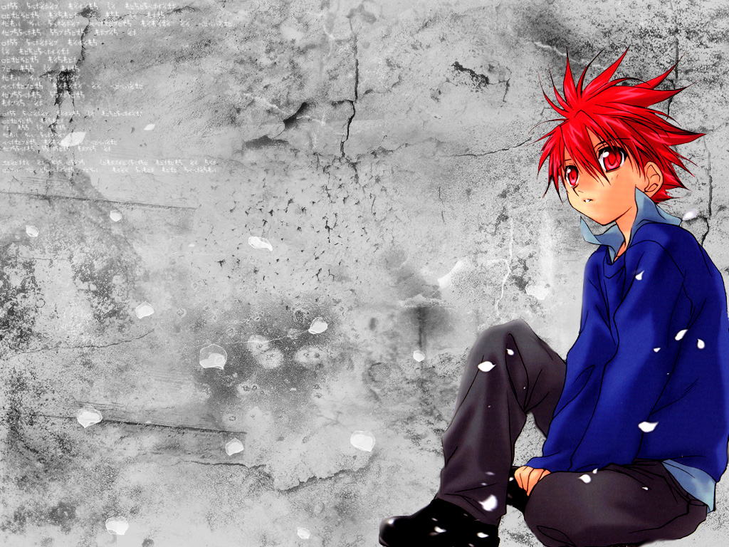 Description: A man with red hair sitting on a rock wall with snow falling on him and his legs crossed and his feet crossed.