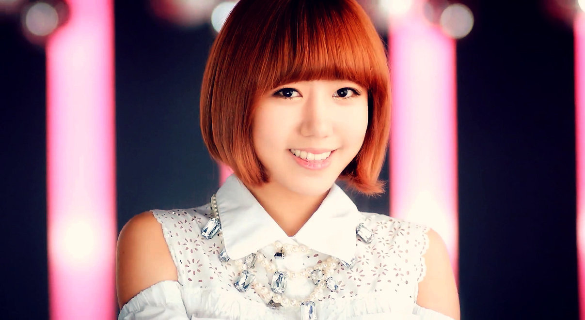 Description: A woman with red hair and a white shirt smiling at the camera with pink lights behind her and a black background.