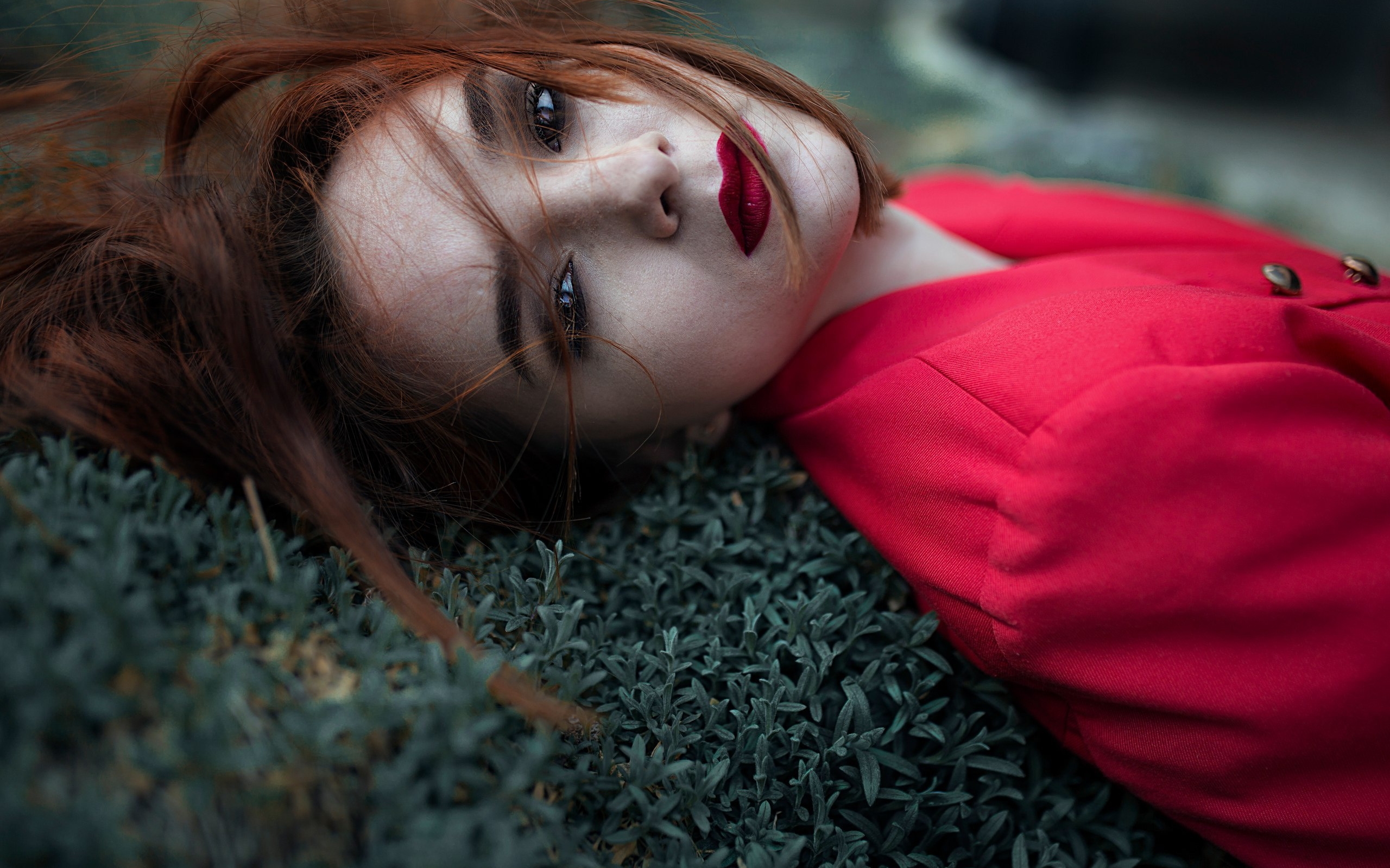 Description: A woman with red hair laying on the ground with her eyes closed and eyes closed.