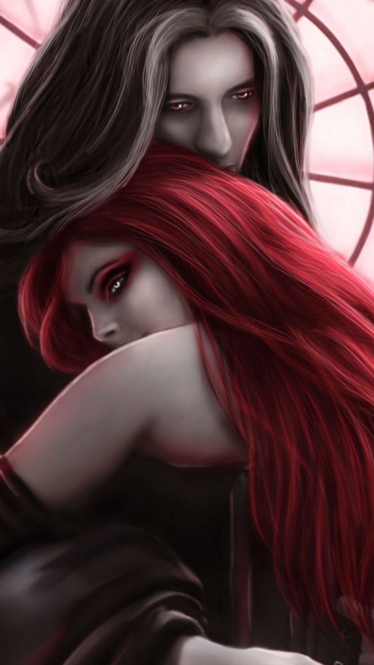 Description: A painting of two women with red hair and a pink umbrella behind them.