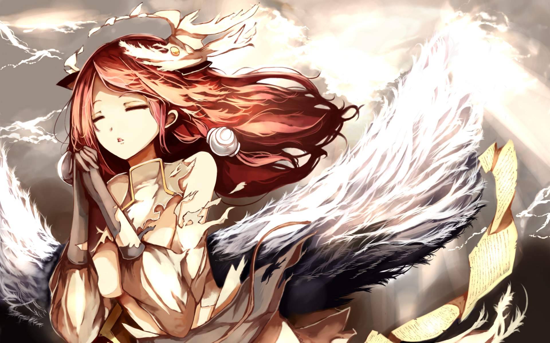 Description: A girl with red hair and angel wings in a white dress with a sword in her hand and a cloud in the background.
