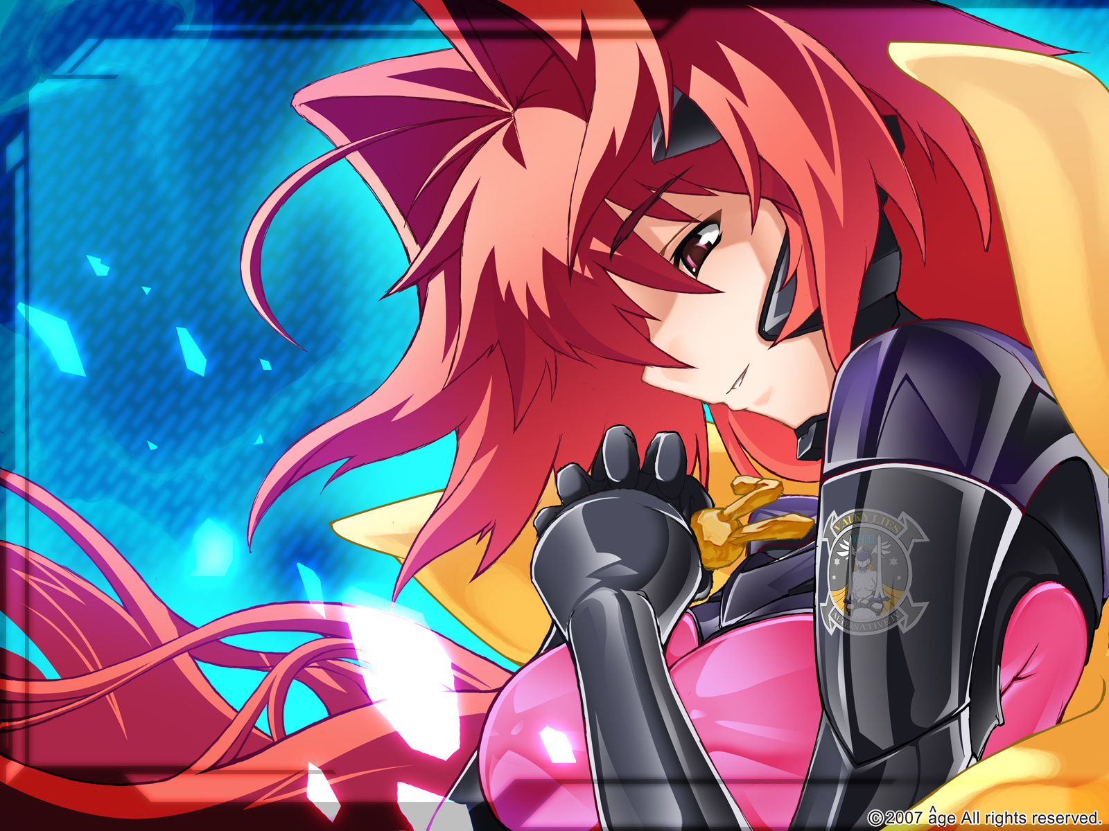 Description: A woman with red hair and a black suit and a yellow bow tie and a black glove and a blue background.