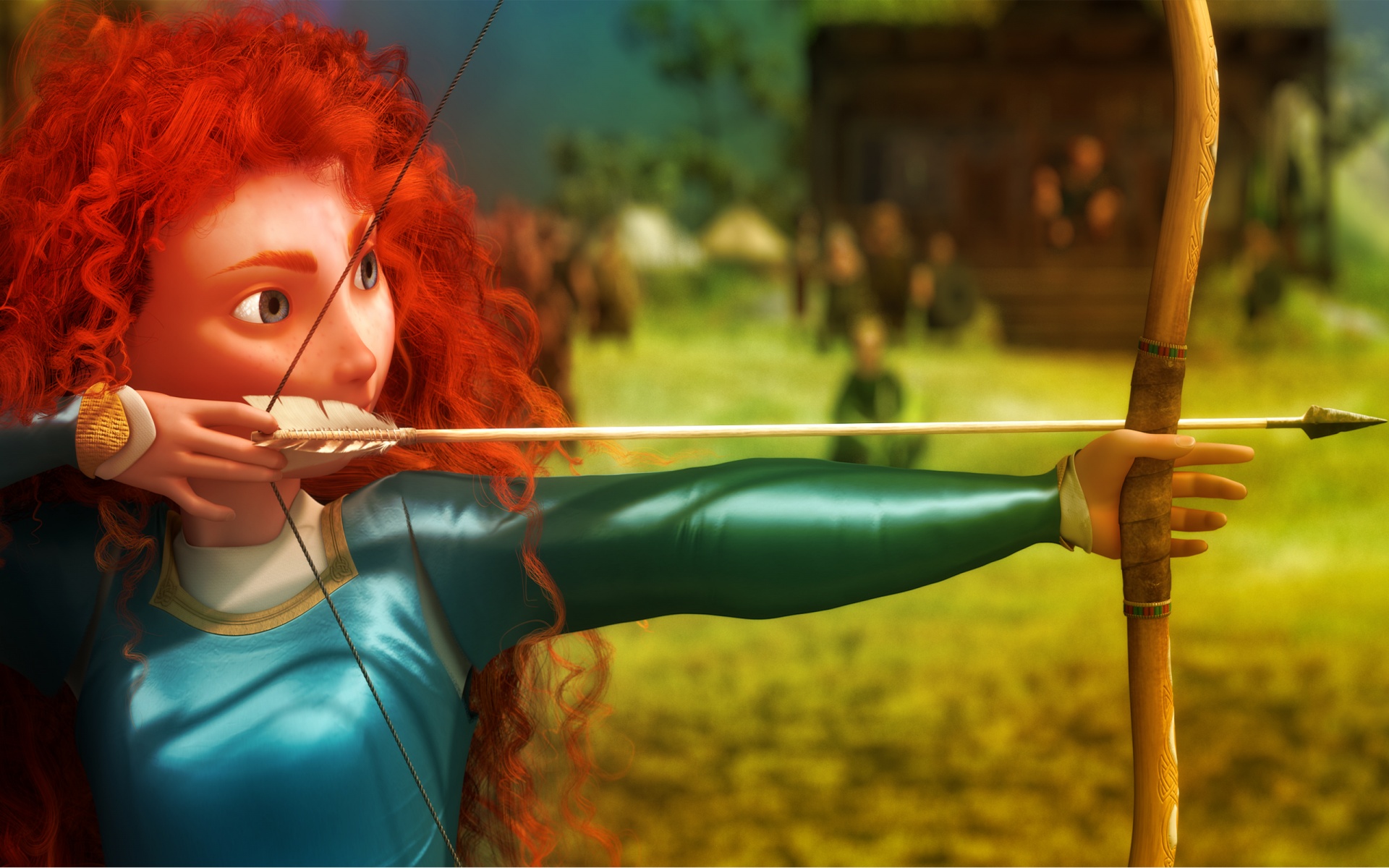 Description: A red haired girl aiming a bow at a target with a bow and arrow in her hand.