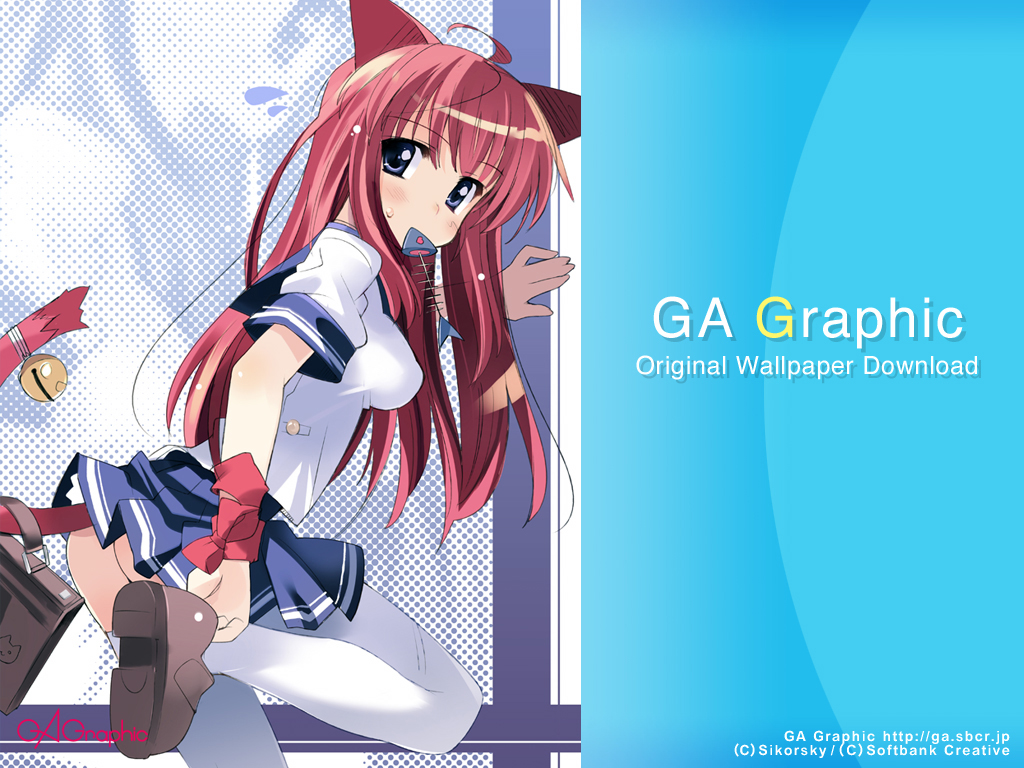 Description: A girl with long red hair and a cat ears hat is standing in front of a blue background with a white background.