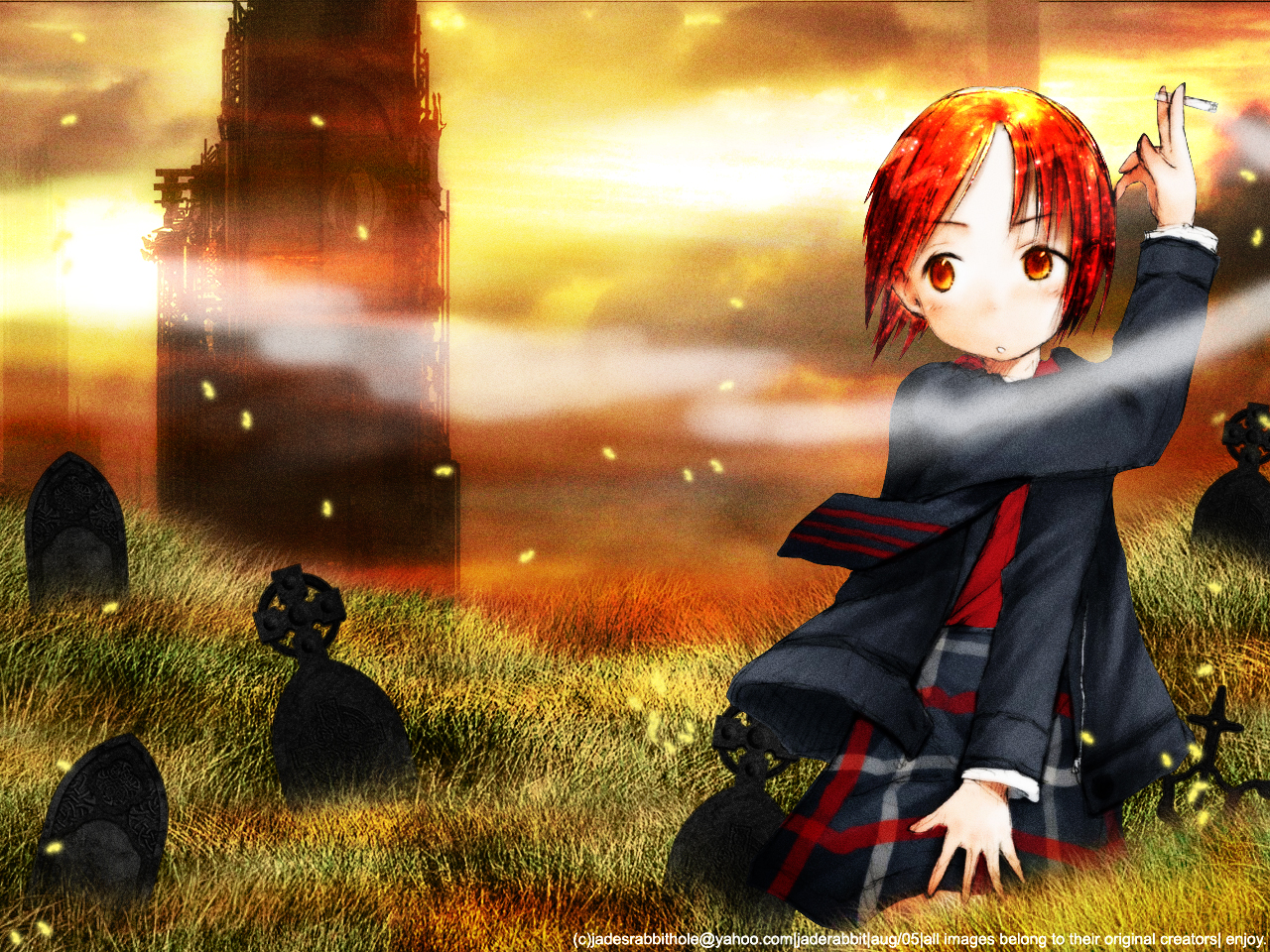 Description: A girl with red hair sitting in a field with a clock tower in the background and a foggy sky.
