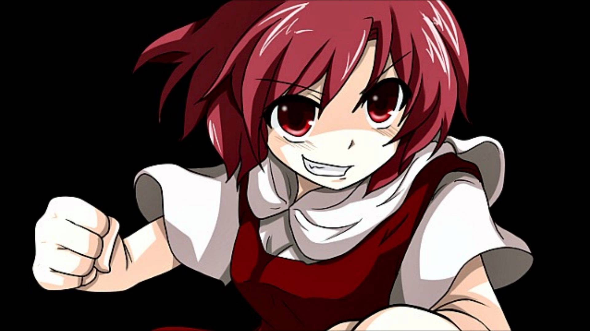 Description: A girl with red hair and a white shirt is pointing at the camera with her hand up and a black background.