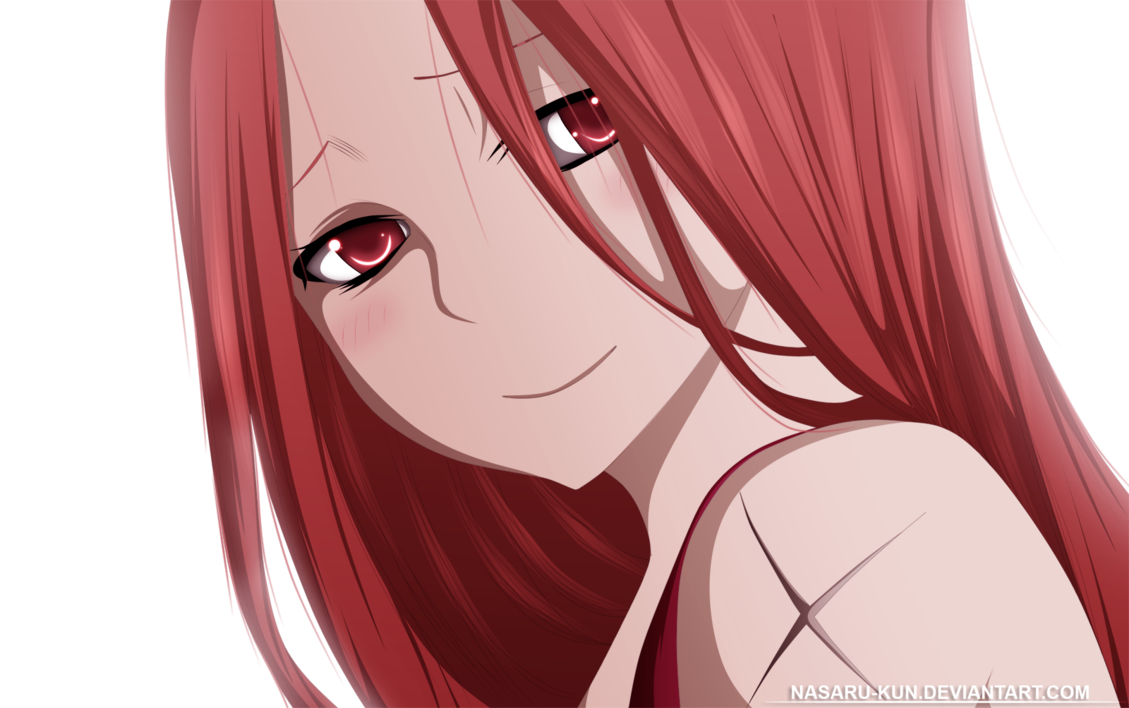 Description: A girl with red hair and red eyes looking at the camera with a sad look on her face and red hair.