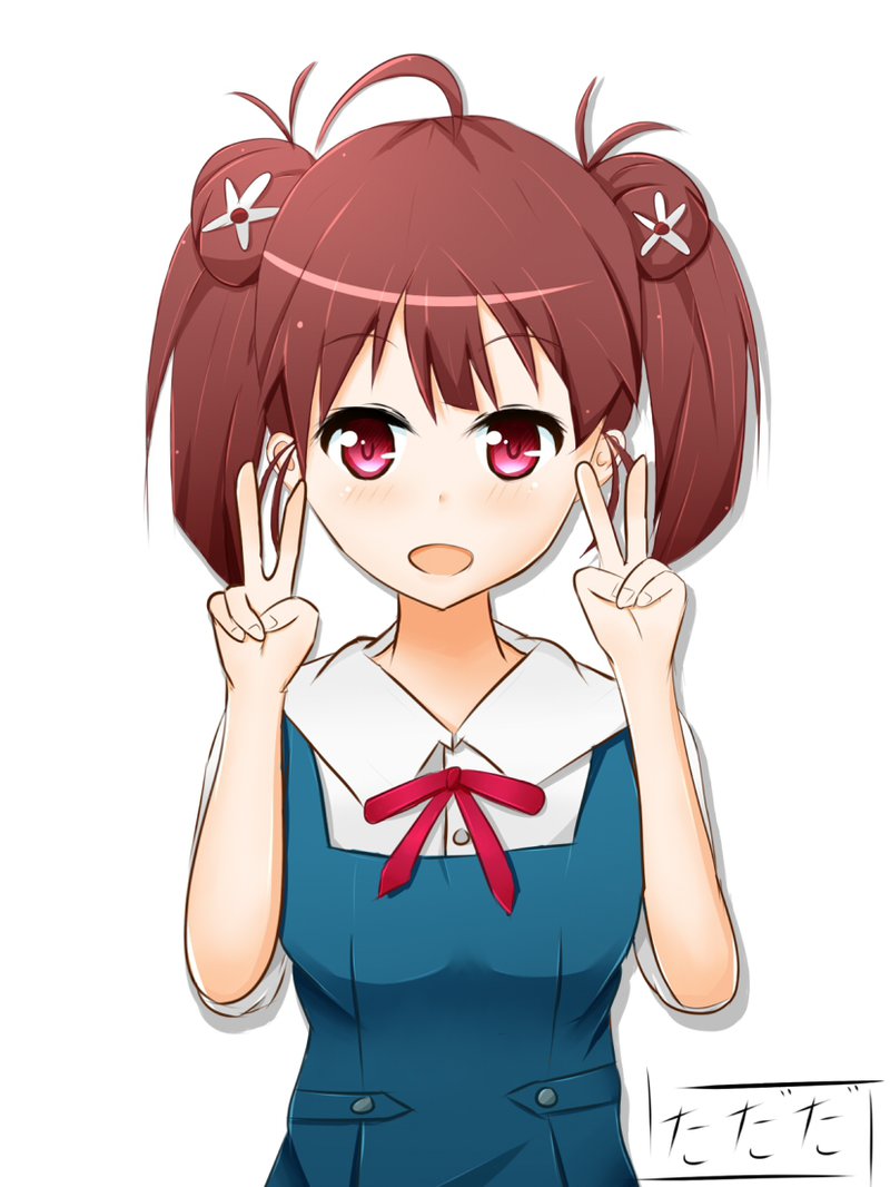 Description: A girl with red hair and a blue dress is making the vulcan sign with her hands and a red bow around her neck.