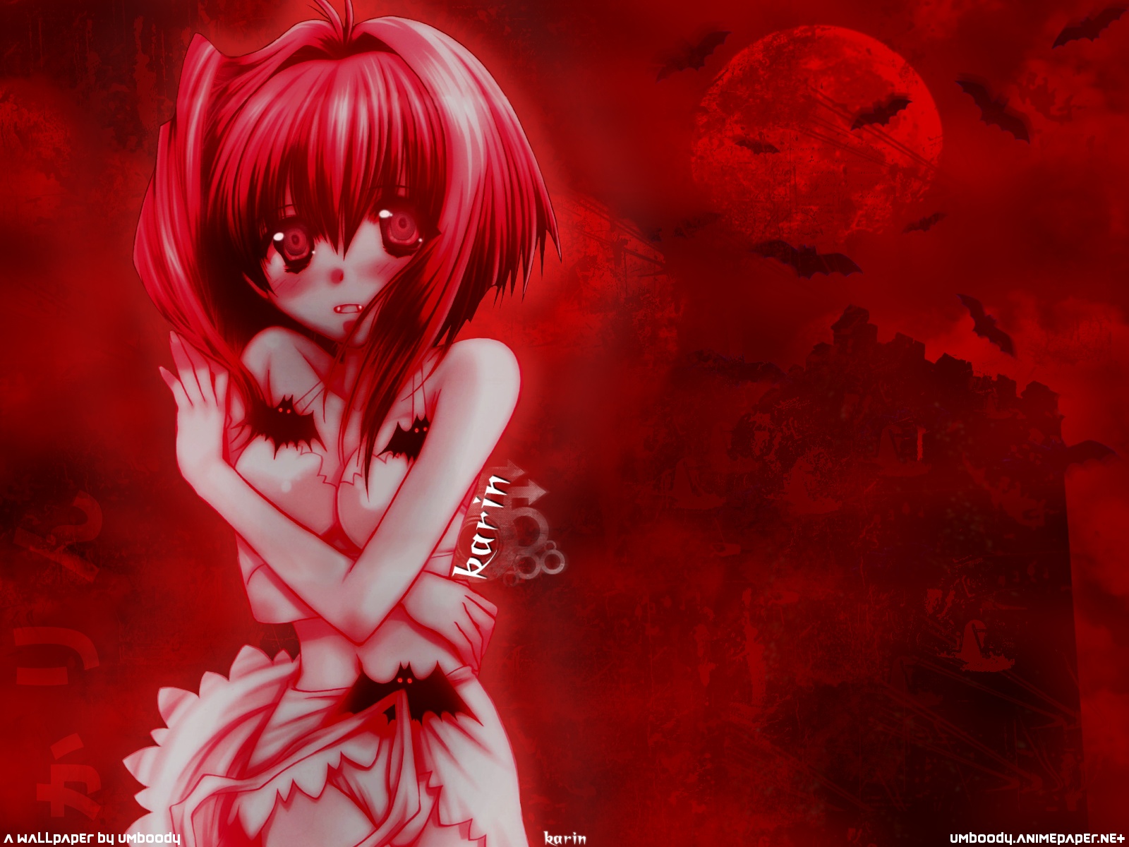 Description: A red haired girl with red eyes and a black dress with a red background and a red moon behind her.
