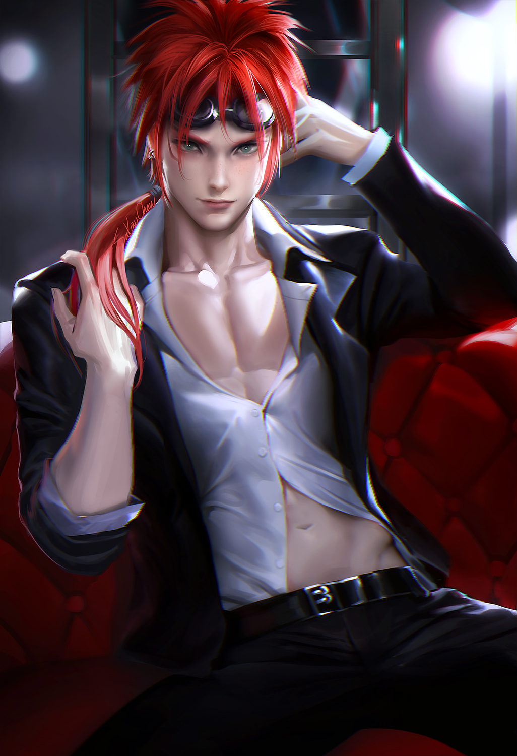 Description: A man with red hair sitting on a red couch in a room with a red chair and a red couch.