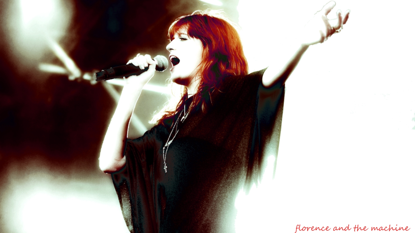 Description: A woman with red hair singing into a microphone with her hand up in the air and her right arm raised.
