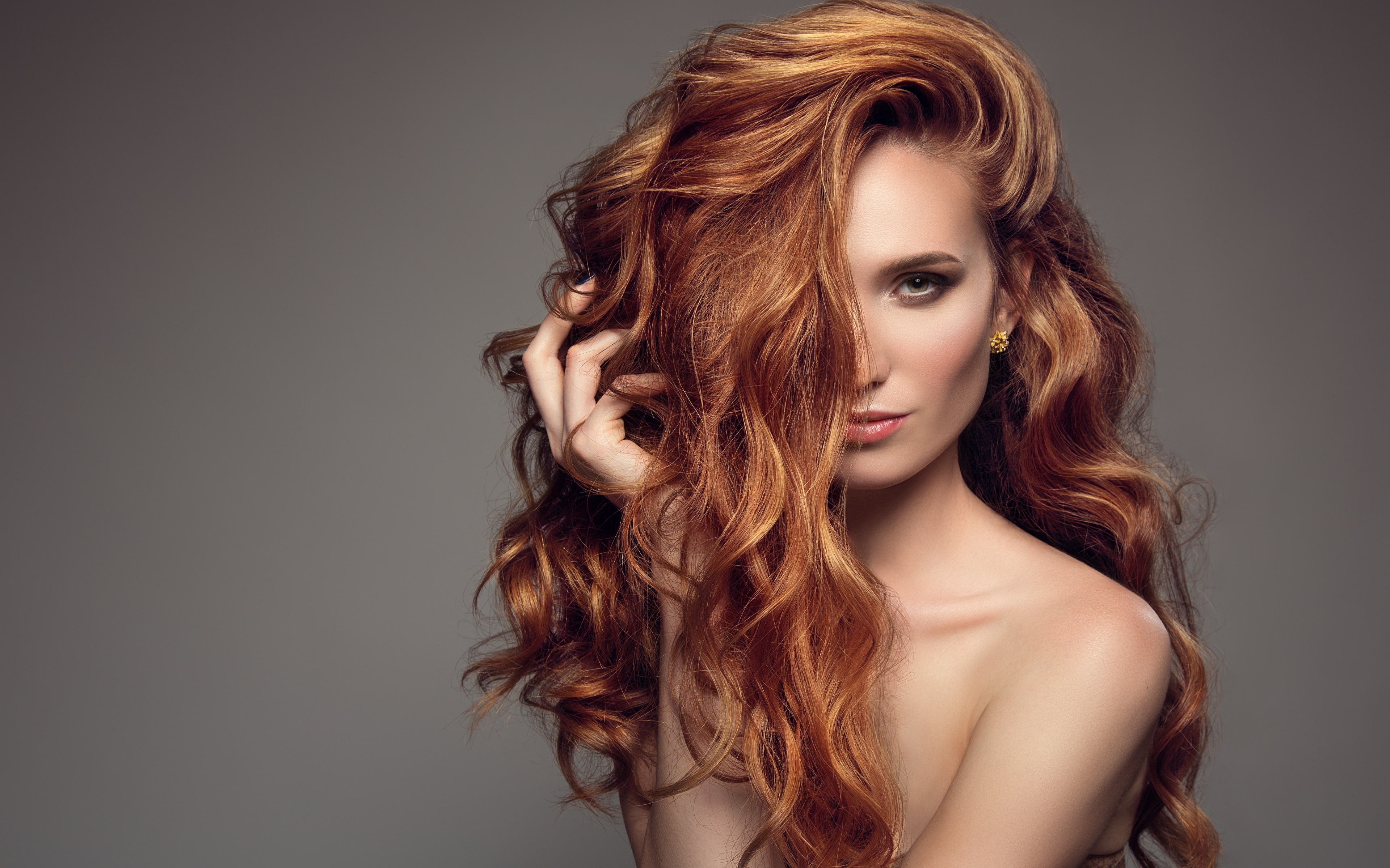 Description: A woman with long red hair is posing for a picture with her hands on her head and her hair blowing in the wind.
