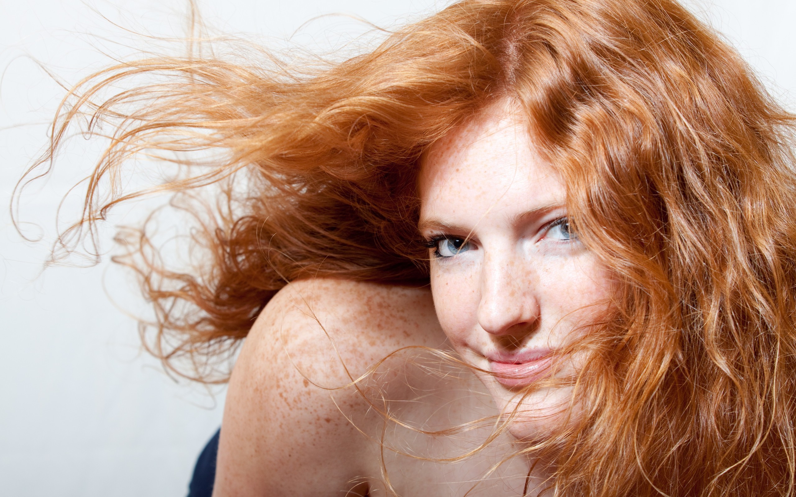Description: A woman with red hair is posing for a picture with her hair blowing in the wind and looking at the camera.