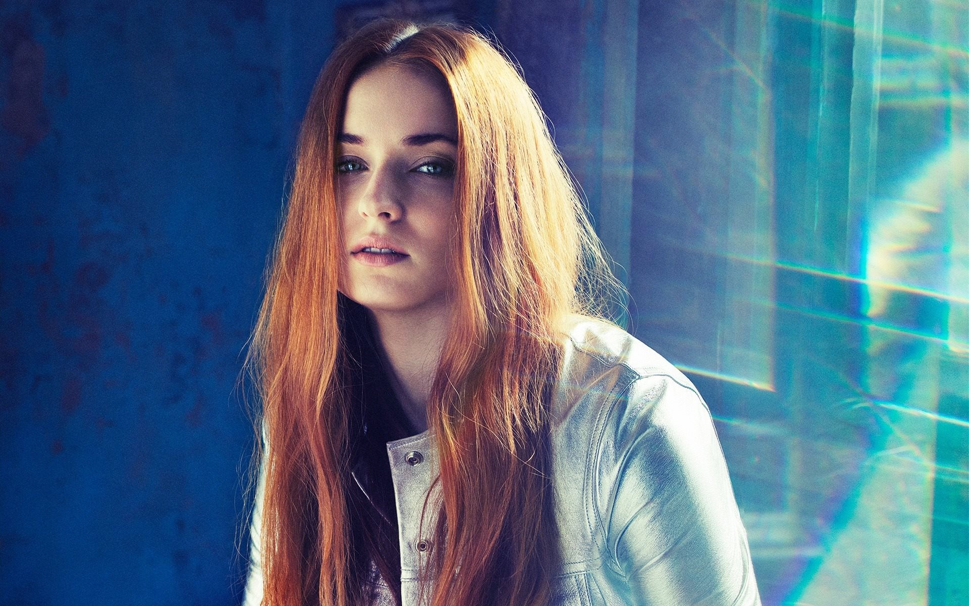 Description: A woman with long red hair is posing for a picture in a blue room with a blue wall and a blue curtain.