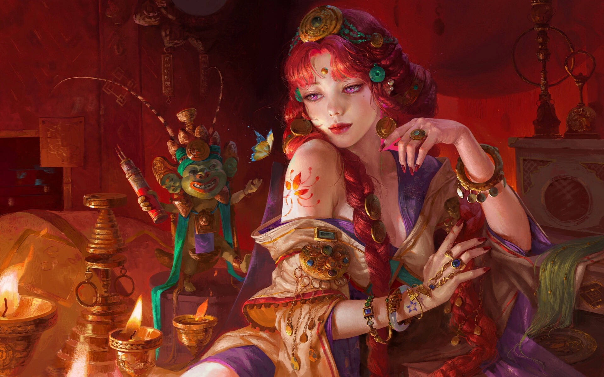 Description: A painting of a woman with red hair and jewelry on her hands and hands on her chest.