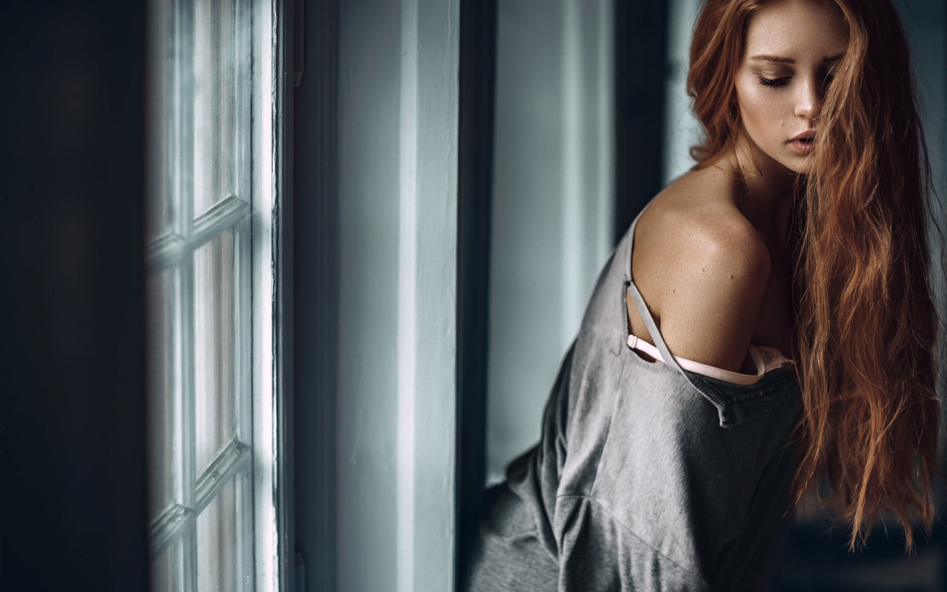 Description: A woman with long red hair leaning against a wall with her eyes closed and her head tilted back.