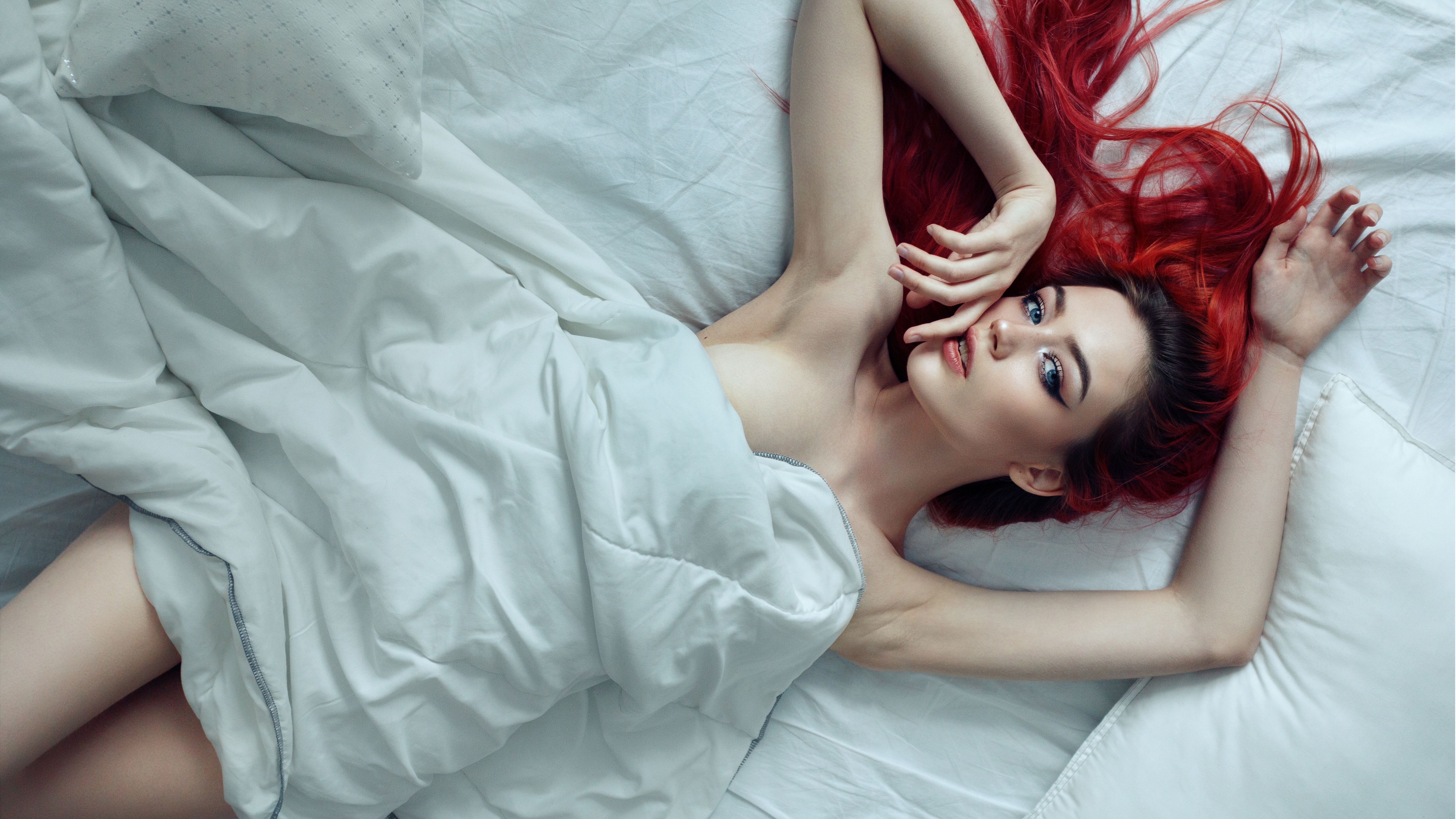 Description: A woman with red hair laying on a bed with white sheets and sheets on it's sides and a white pillow.