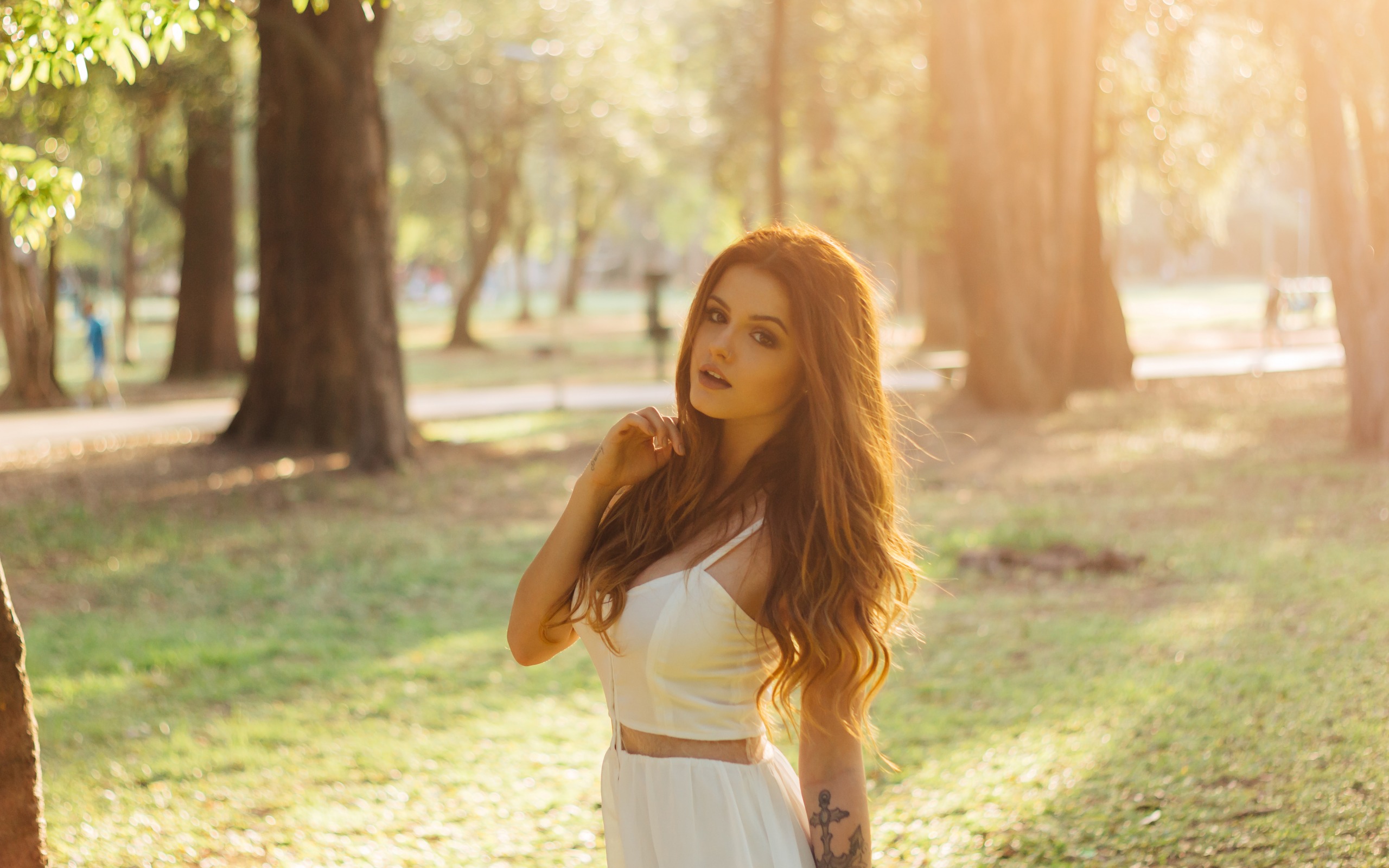 Description: A woman with long red hair standing in a park with trees and grass in the background.