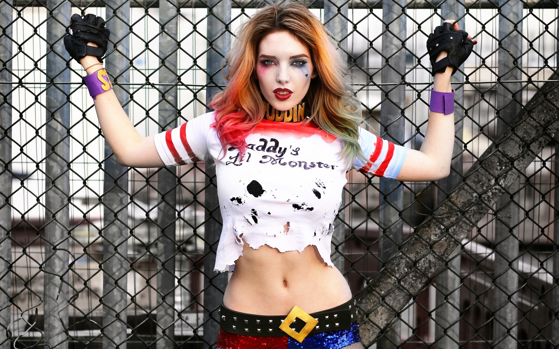 Description: A woman with red hair and makeup is posing in front of a fence with her hands up in the air.