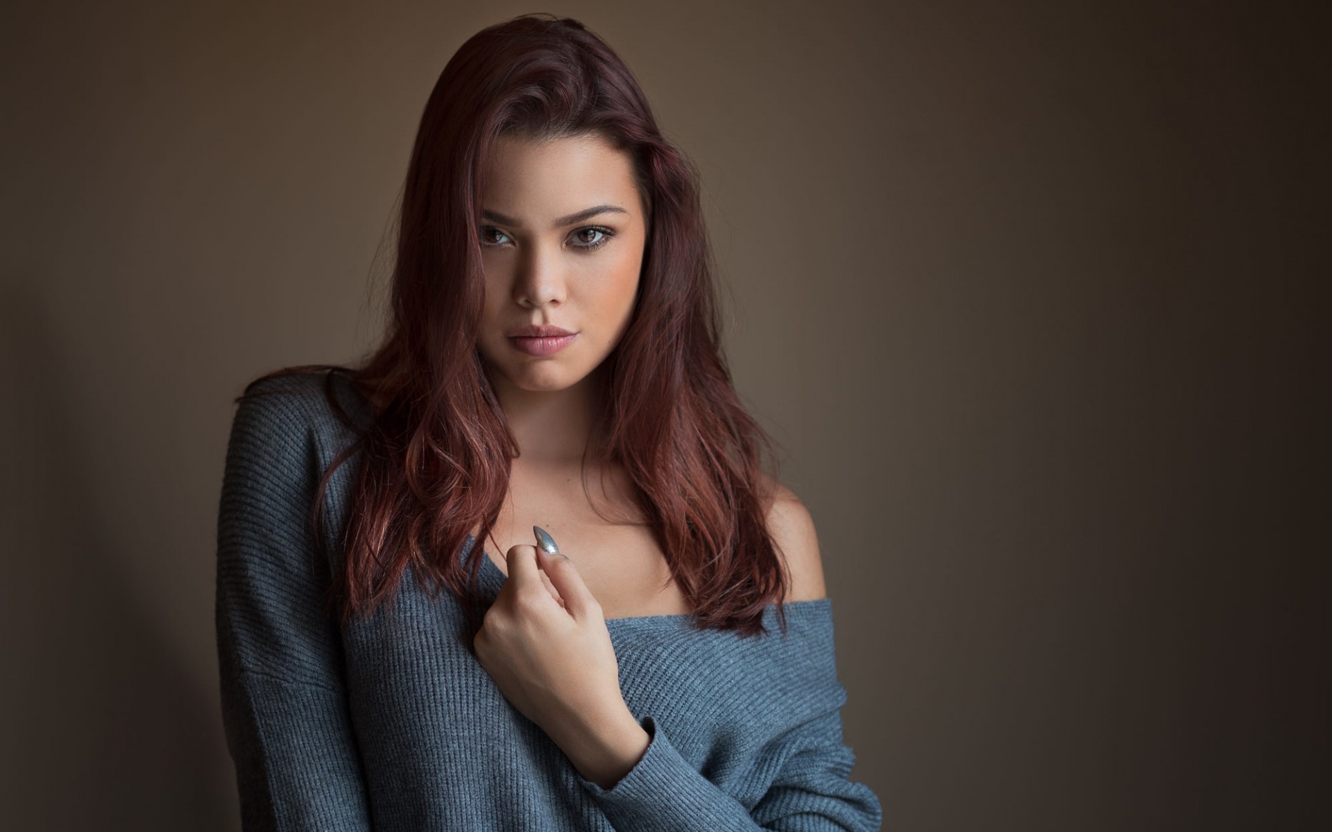 Description: A woman with red hair is posing for a picture in a sweater and jeans.
