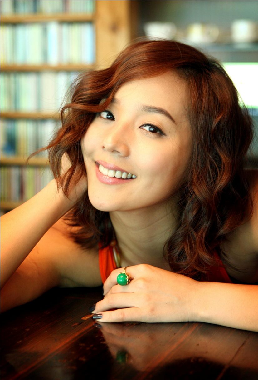 Description: A woman with red hair and a smile on her face sitting at a table with a bookcase in the background.