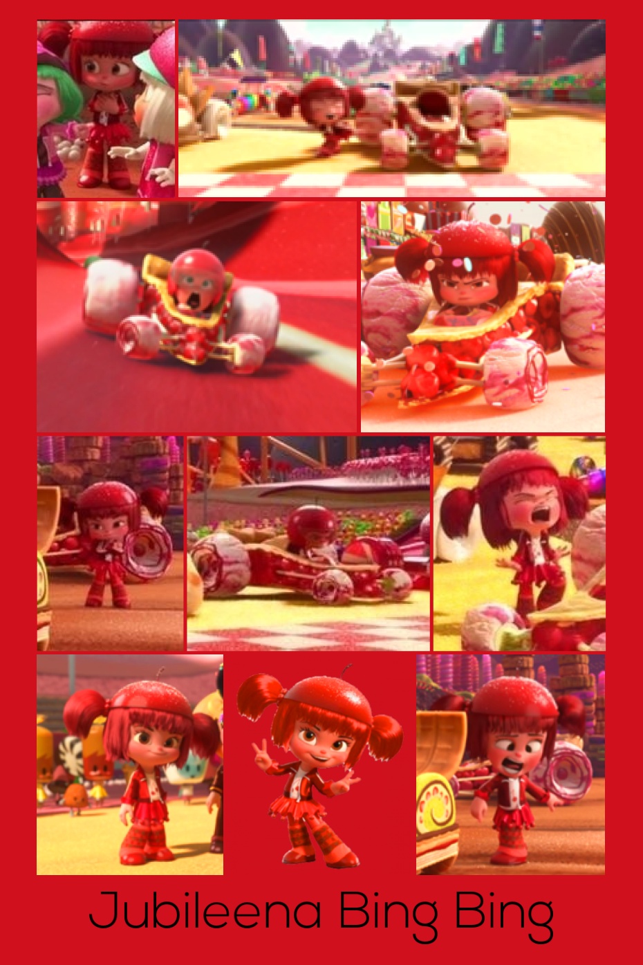 Description: A collage of images of a girl in a red outfit and a red hat with a red background.