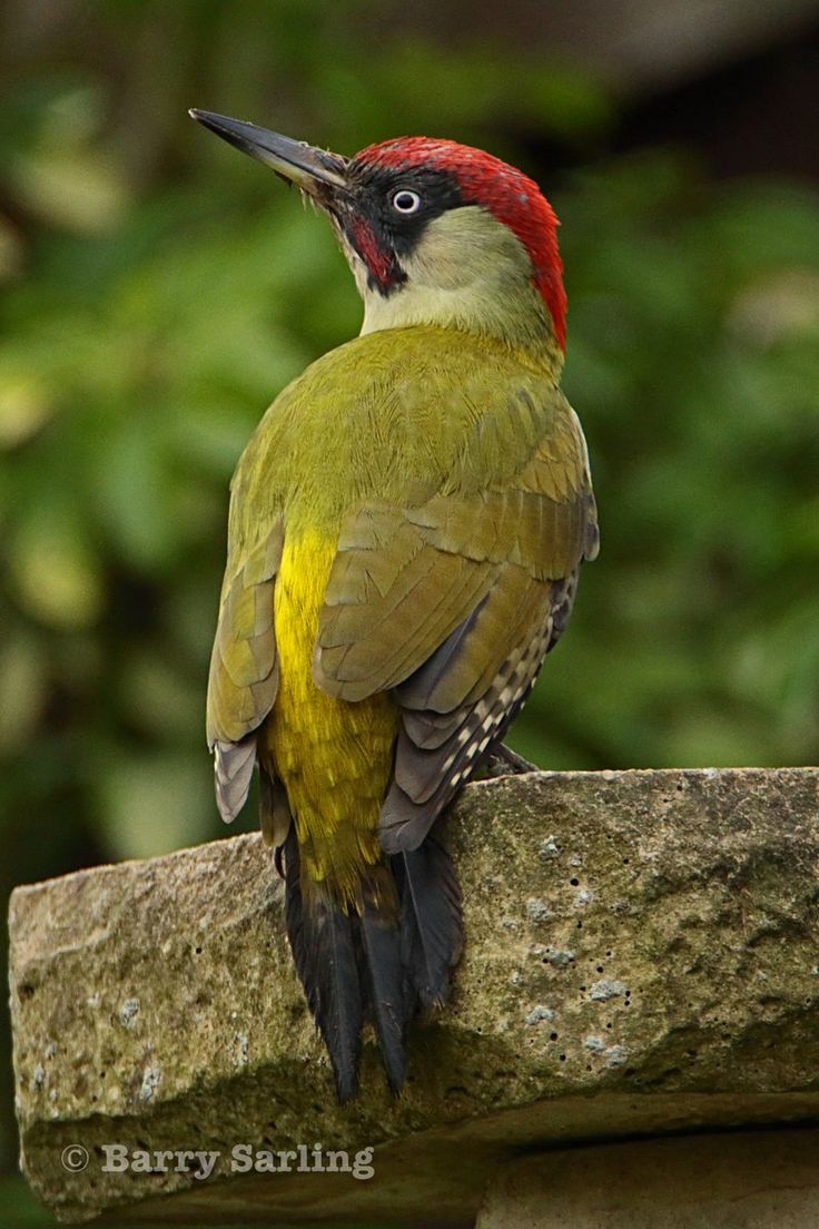 Description: A bird with a red head sitting on a branch in a tree branch enclosure with green foliage in the background.