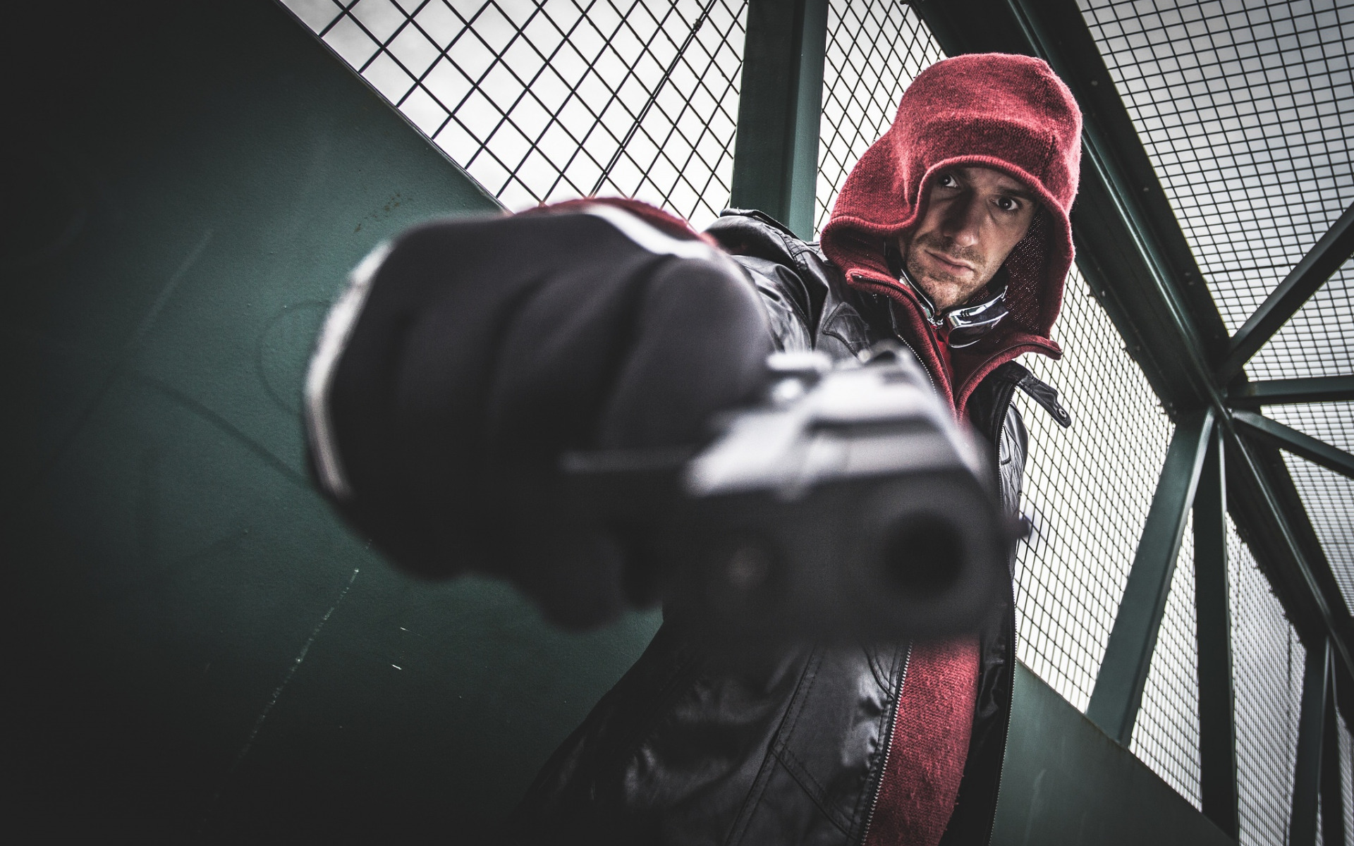 Description: A man in a red hoodie pointing a gun at the camera with a blurry background of a green wall.